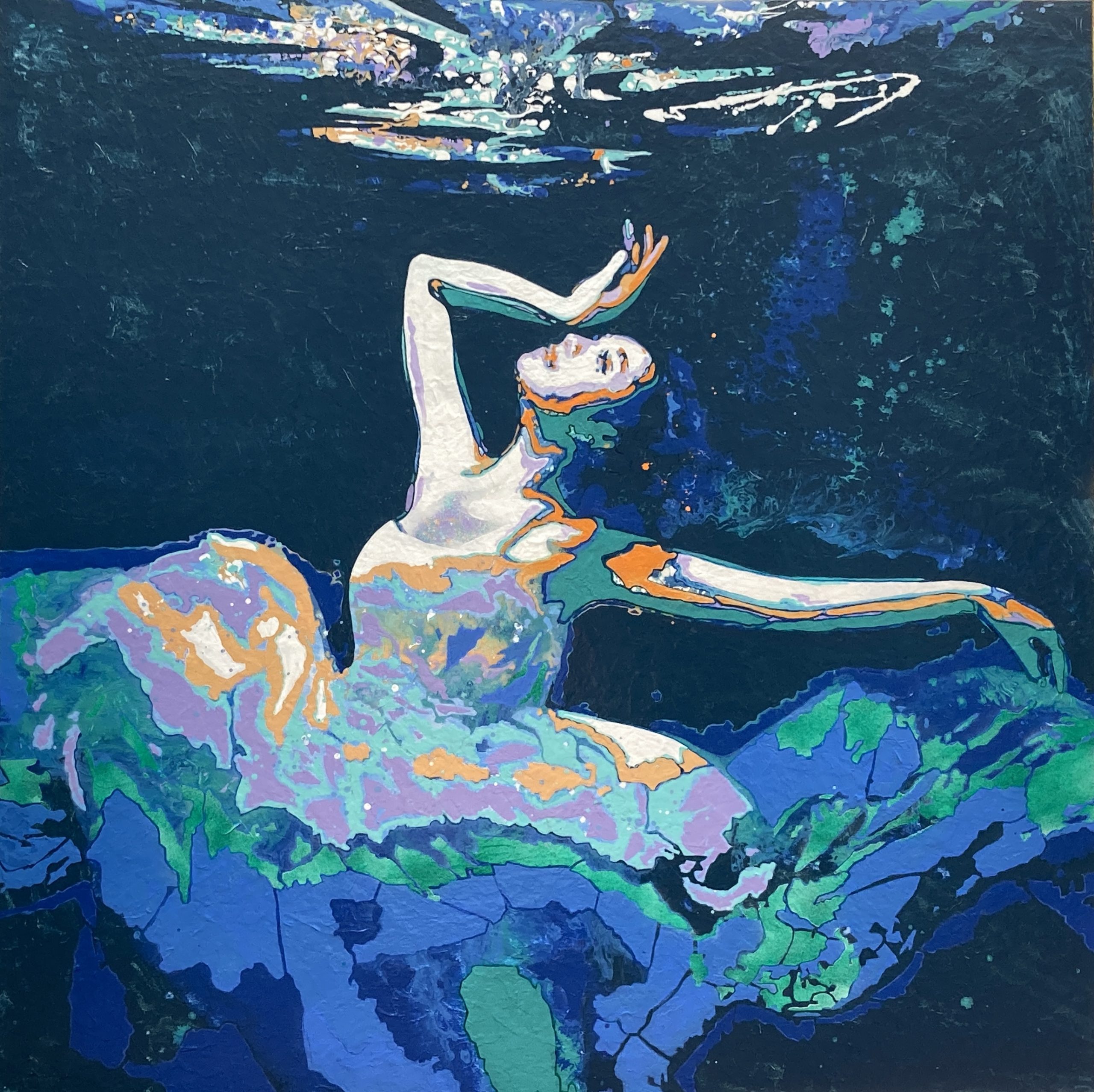I work from found and created photographs and film stills. At first glance I was immediately taken by the sense of poise in this image… the young ballerina strikes a ballet pose underwater and the elegant wrists, the feeling of flight, the open heart, and the upward gaze at her reflection in the waters surface represents a feeling of hope to me. Aptly named after Emily Dickinson’s poem, “‘Hope’ is the thing with feathers – that perches in the soul”, the canvas is covered in Japanese Rice Paper to give a lovely texture that is akin to the movement on the surface of water.