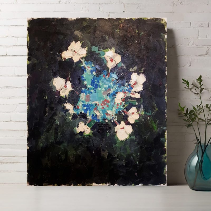 I view painting as sheer passion and feeling. Through my process I don’t seek to depict a set idea or subject, but instead I let scenes and dynamic movement emerge organically.