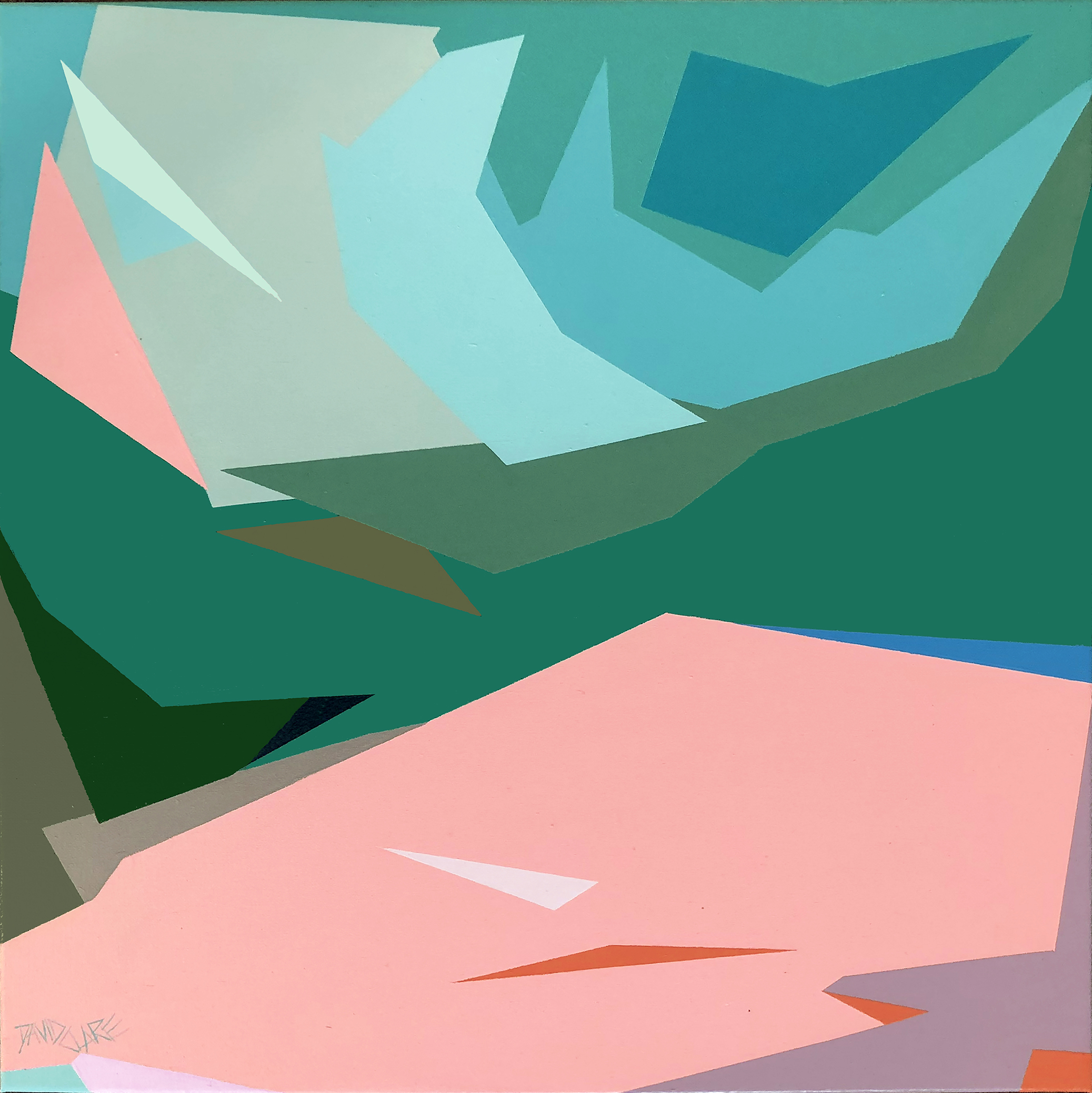 Hot Dunes by David Clare – The first of my new series of paintings created by designing the image on computer, manipulating the colours scheme and shapes, then painting that design. This painting has the unintentional look of sand dunes leading into mountain ranges.