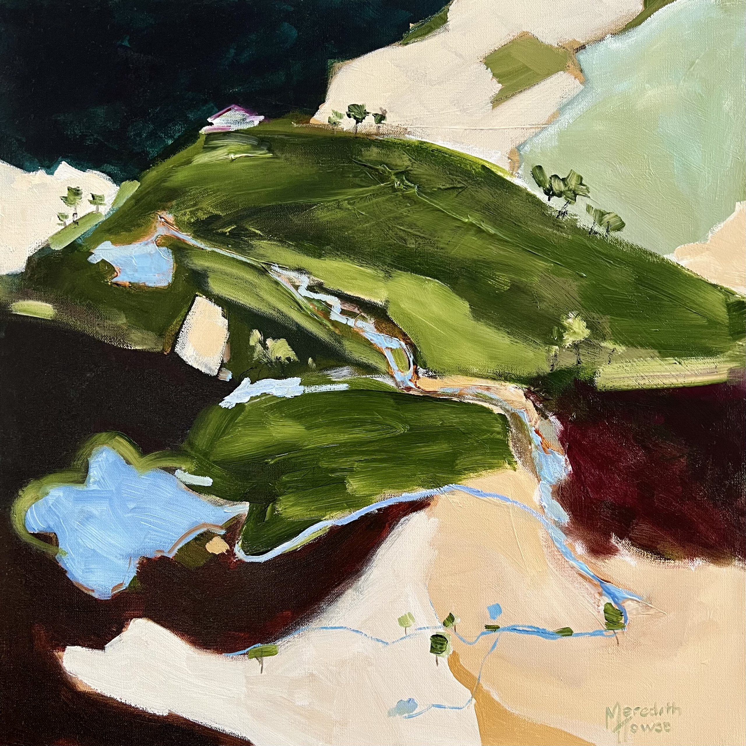 This is an abstract landscape using earthy, rich dark greens, warm browns and yellow ochre, with a splash of blue to symbolise rivers, dams and sky.