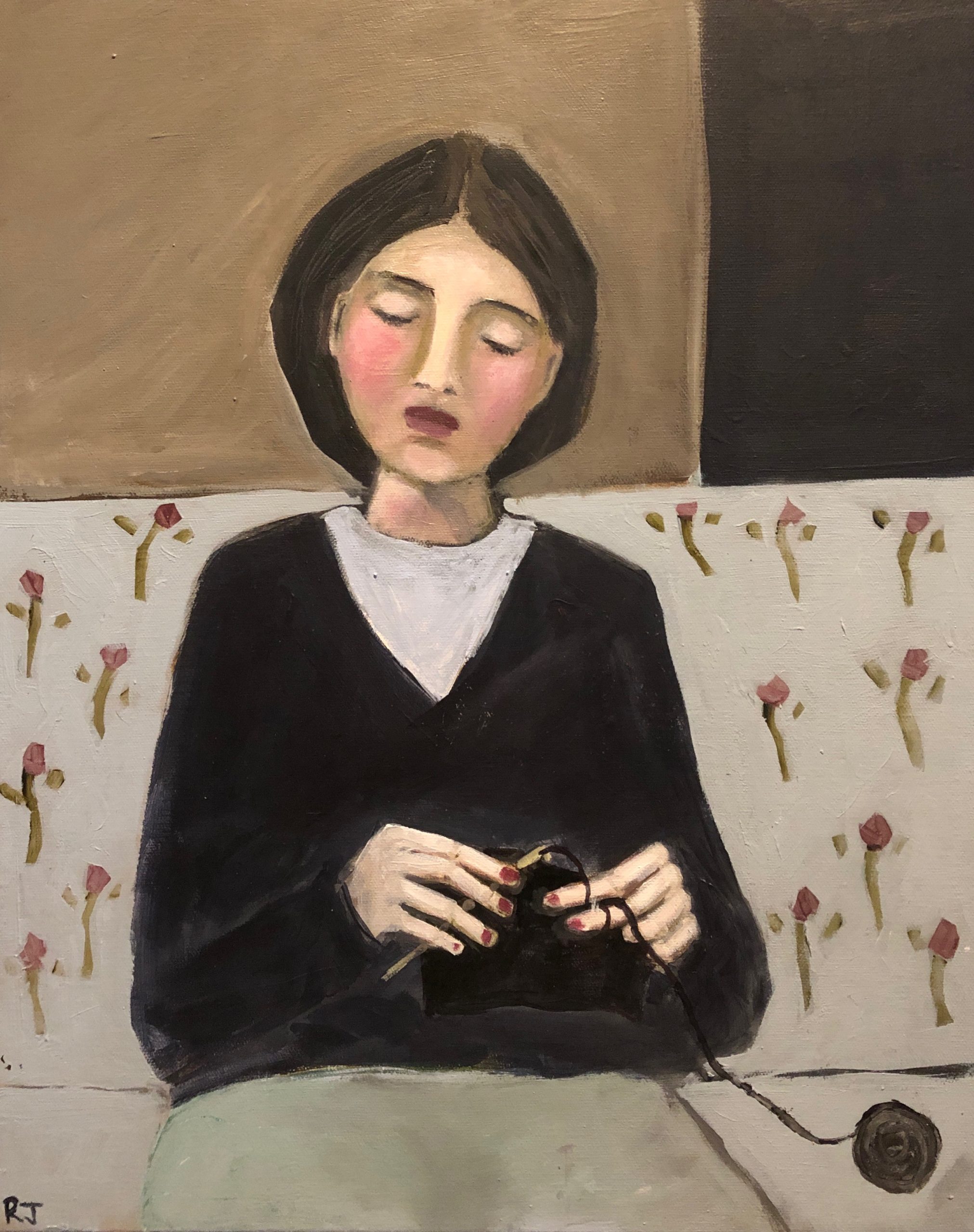 This painting celebrates the craft of crochet — and was inspired by a painting called The Sock Knitter by Grace Cossington Smith.