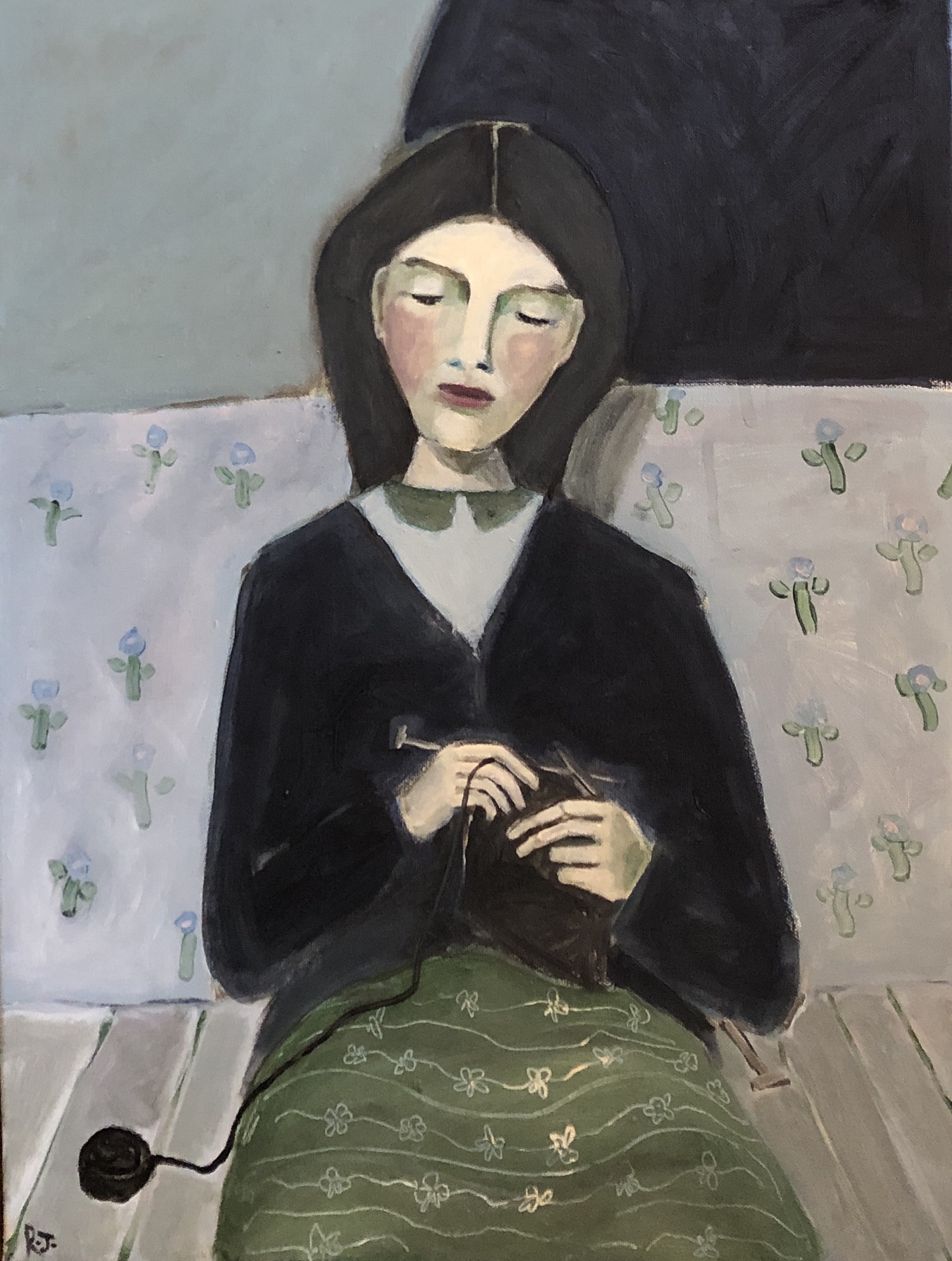 This painting celebrates the craft of knitting — and was inspired by a painting called The Sock Knitter by Grace Cossington Smith.