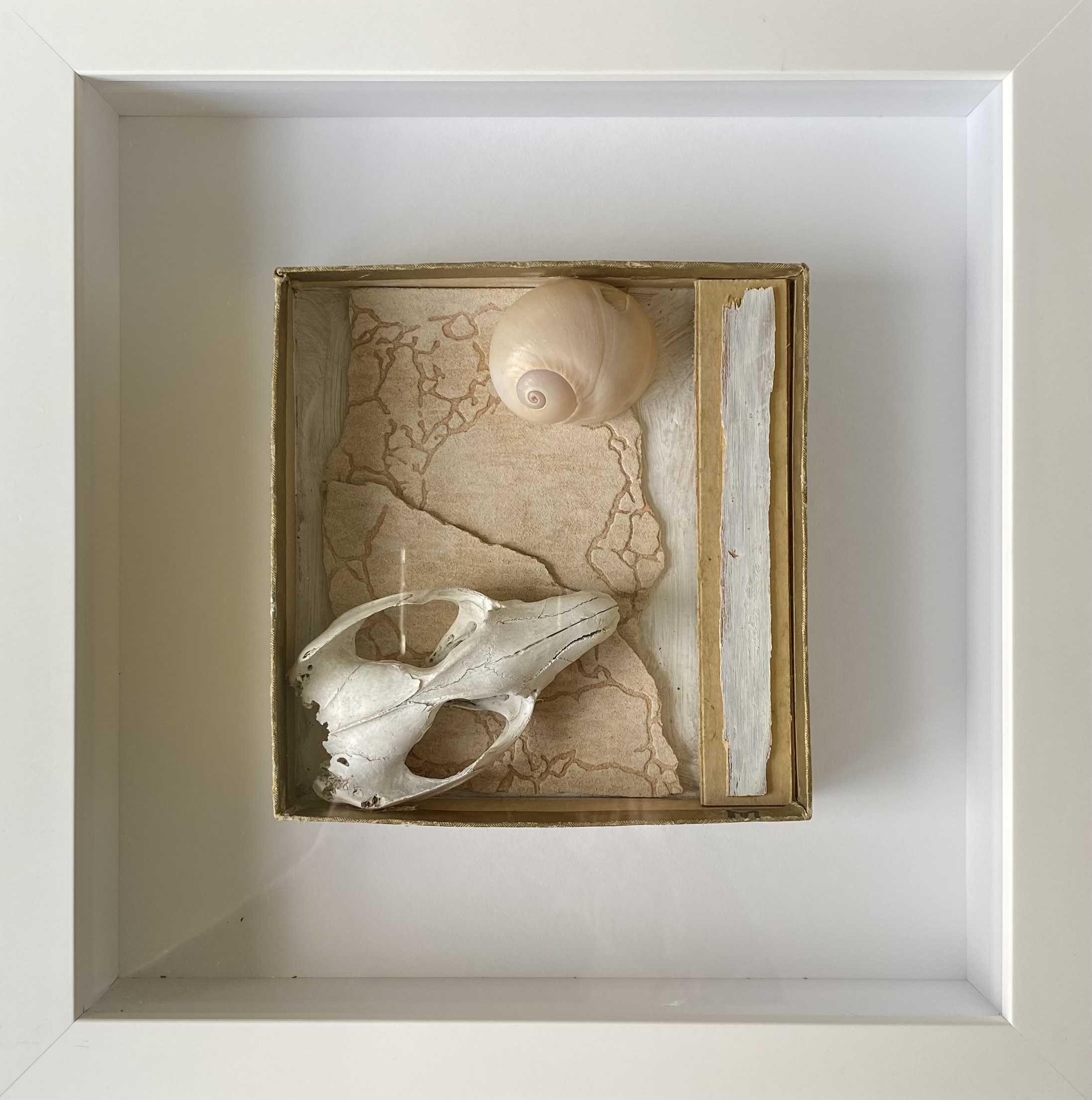 Howling at the Moon by Mandy McGuire – Â is a small intimate assemblage of found objects that the artist considers precious and meaningful. The objects were collected from different locations in Queensland, including remote areas in the far west. The Lino, for instance, is collected from an old house at the township of Windorah. The skull, which is most likely that of a feral cat, represents the wolf spirit while the bosom-like shell represents the moon. The artwork is intended to appear as if it is a museum specimen – something precious and culturally significant. This artwork was part of a solo exhibition by the artist in 2023 entitled Quietude is a Place. Professionally framed.