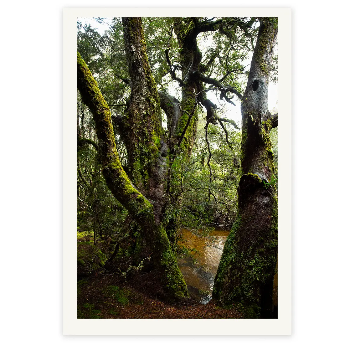Fine Art Wilderness PhotographyIn the cool rainforest of northwest Tasmania’s Cradle Mountain region, silvered trees stand close, their moss-covered trunks twisted and leaning as they strive for the light above. Beneath them, tannin-coloured waters flow through the undergrowth. A view of the forest’s intricate forms and the subtle tension that shapes it.