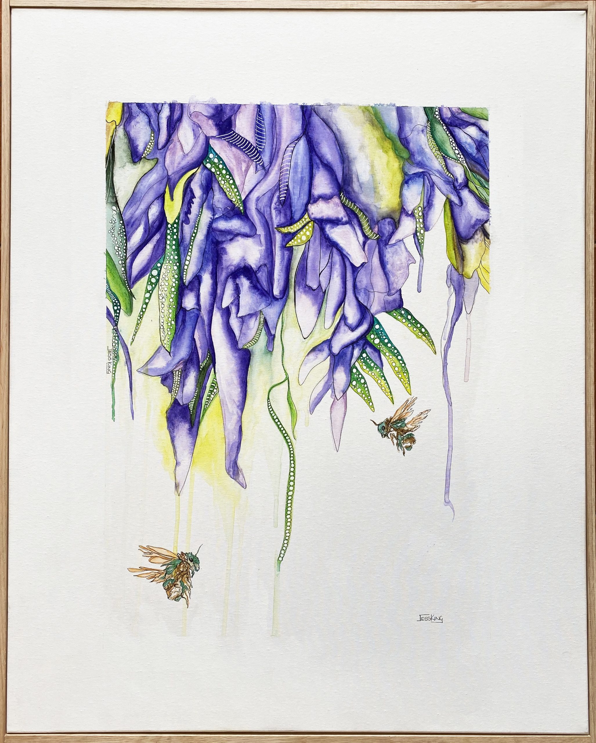 Humming by Jess King – Humming bees hovering around a bright purple jacaranda tree. Archival gloss varnish.