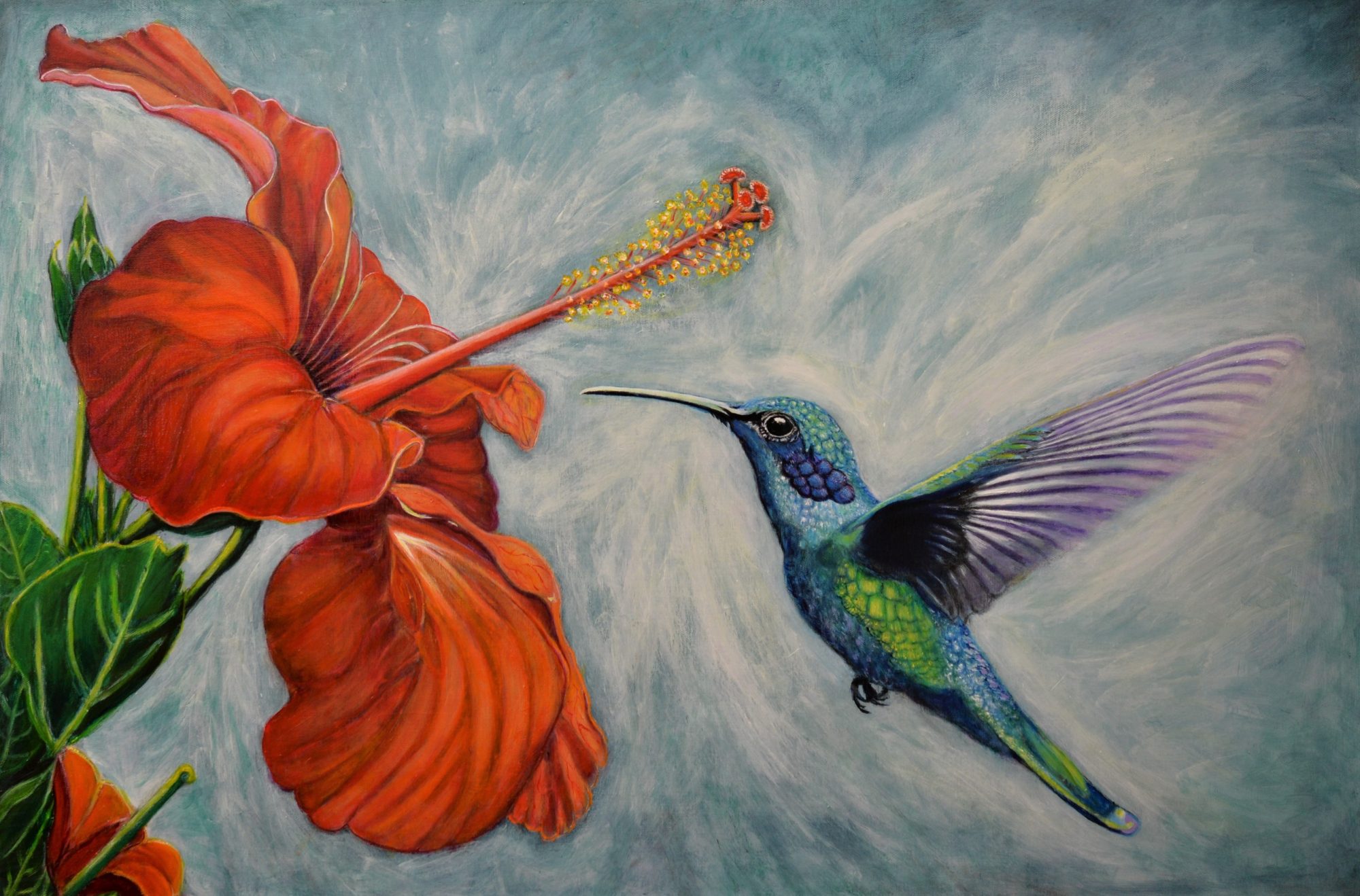 My painting captures the beauty of a hummingbird hovering towards the irresistible hibiscus flower.
