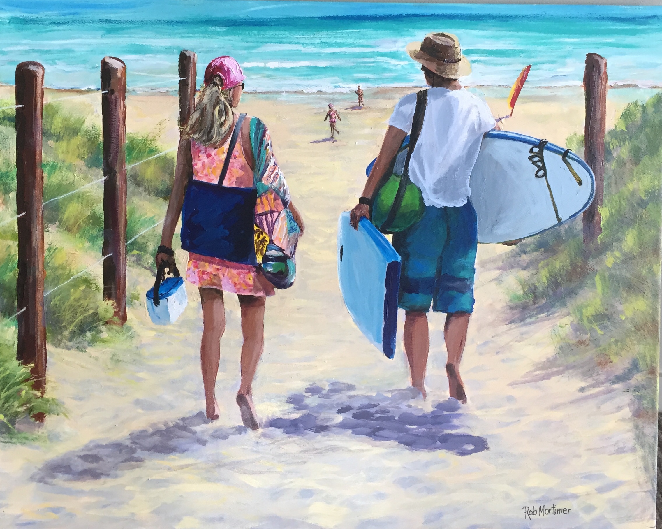Hurry up mum and dad by Robert Mortimer – Parents with their children running with excitement to the beach. Acrylic on stretched canvas with return edges painted. With wire and hooks, felt pads.