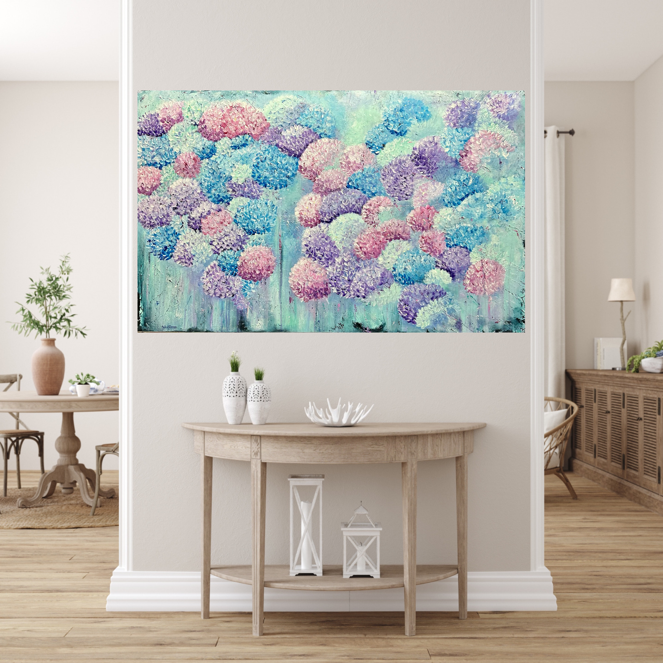 Hydrangea Heaven by Julie Dynan – An original Acrylic  painting. This painting is highly textured and very tactile filled with blue, mint, pink and mauve blooms in abstract palette knife and brush marks. It creates a sense of peace and tranquillity to any room. I so enjoyed painting the many layers to create this piece and hope you enjoy it too.