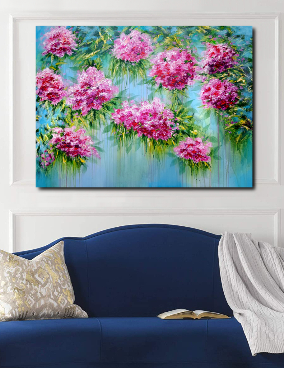 Hydrangea Heaven textured painting by Eva Pearl. Acrylic on canvas, stretched and ready to hang. There is a lot of texture in this painting. This impasto painting was created using a combination of brush strokes and palette knife techniques. It has layers upon layers of textured high quality acrylic paint.