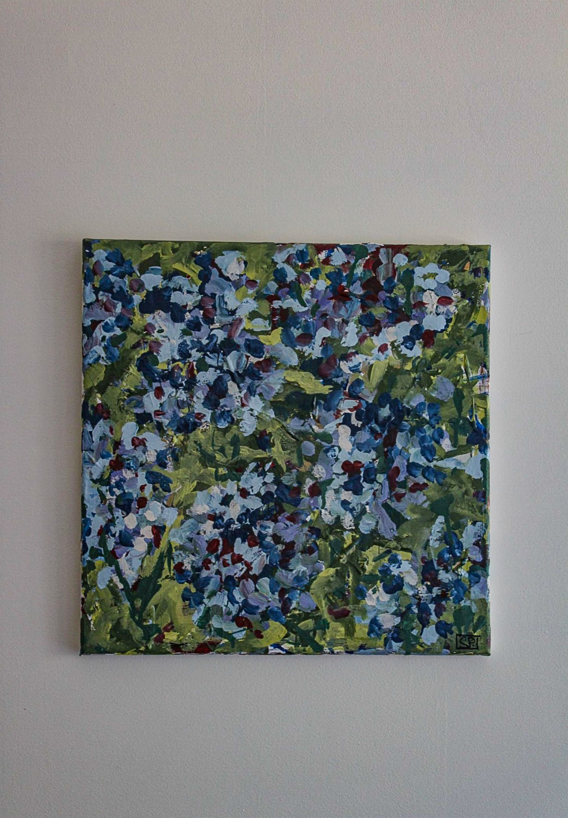 Hydrangea IIII by Sabina Puzey – is an abstracted segment of a hydrangea bush in full bloom in the middle of summer in Perth, WA. The fast brushwork and small marks reflects an urgency in the wind. The blues and greens in this piece offer a sense of calm and serenity much needed in todays world which can only really be found in nature. May you find serenity within your own soul upon viewing it.