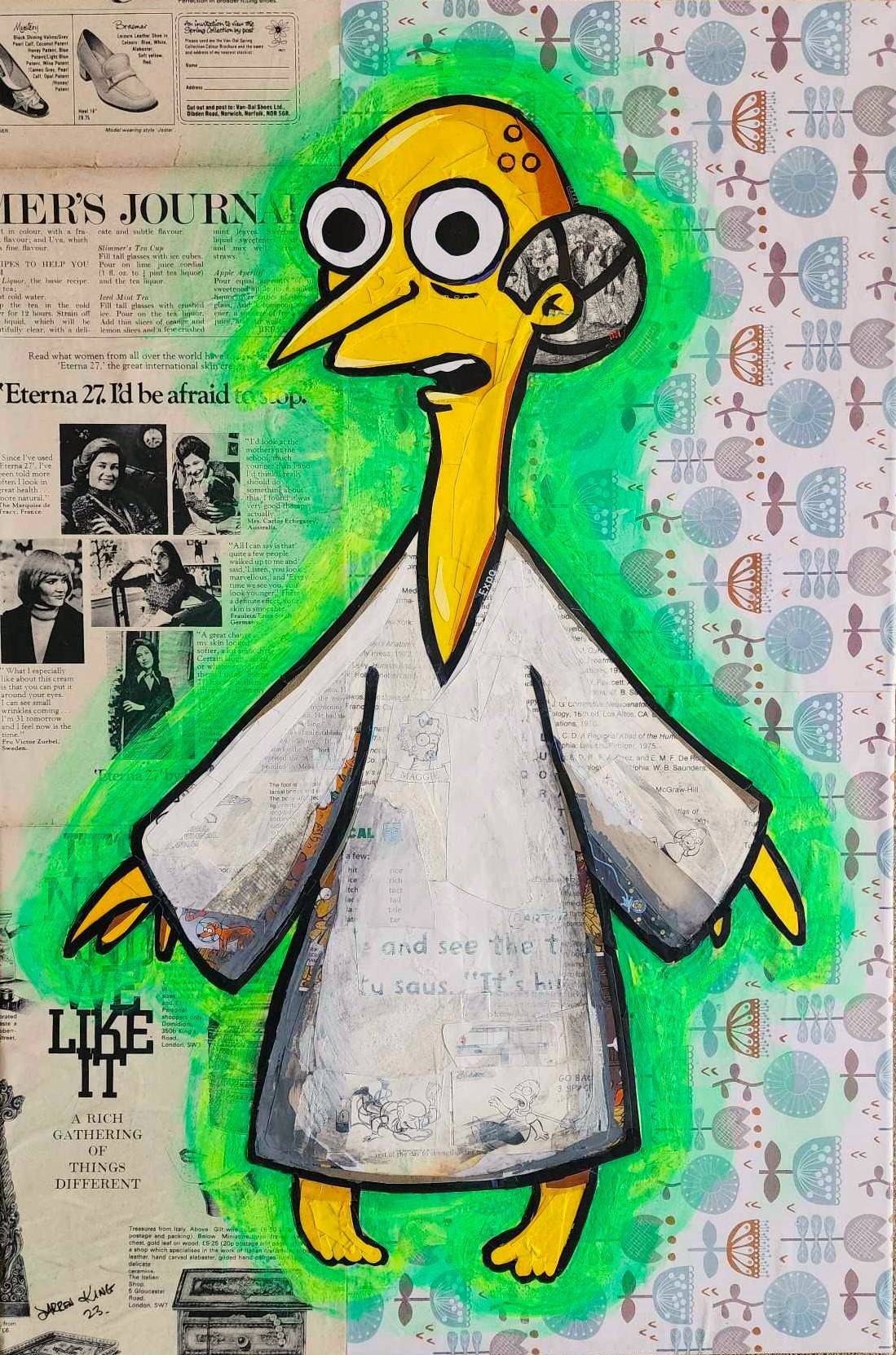 The paper elements have been cut or torn from a Simpsons comic, and old damaged Simpsons board game, vintage mags, packaging, books, brochures and junk mail. Random text and oddities pop up throughout the work, including show characters and tv show references.