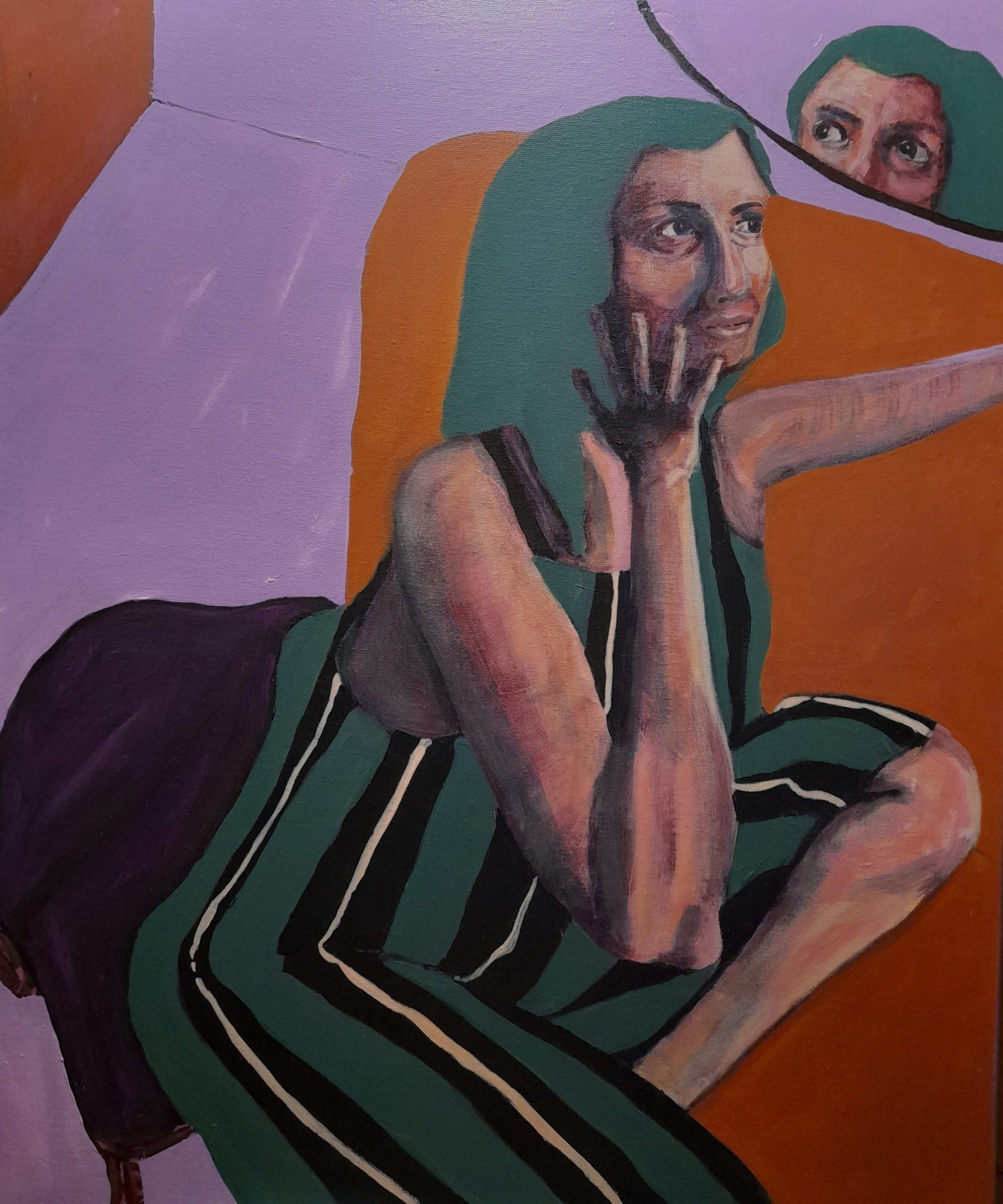 A self-portrait of the artist in which a moment of self-reckoning is captured. This knowing of oneself grows stronger with age. This is also a statement of a women in mid-life, saying its time ‘I choose me’.
