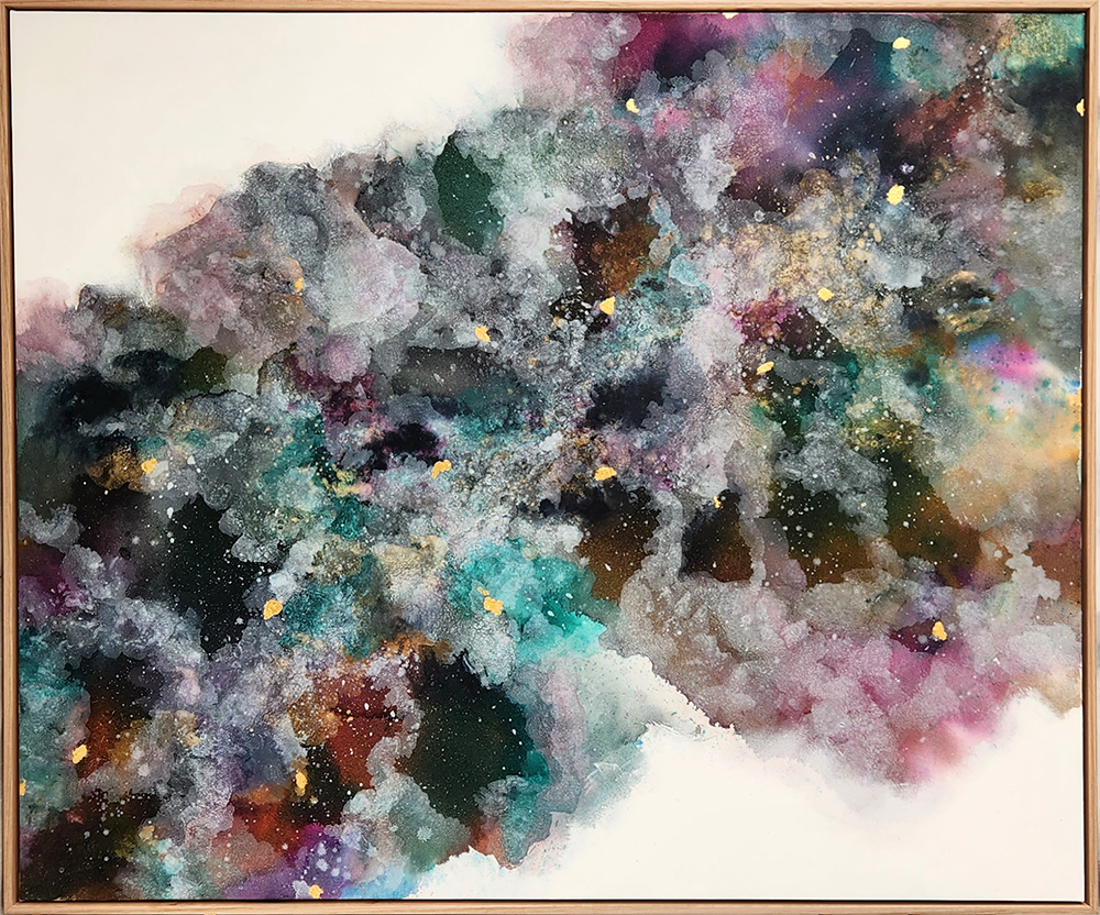 Throughout this original piece, there are metallic gold paints and gold leaf that shine in different lights throughout the day. Bringing the piece to life and giving it an extra special glimmer.