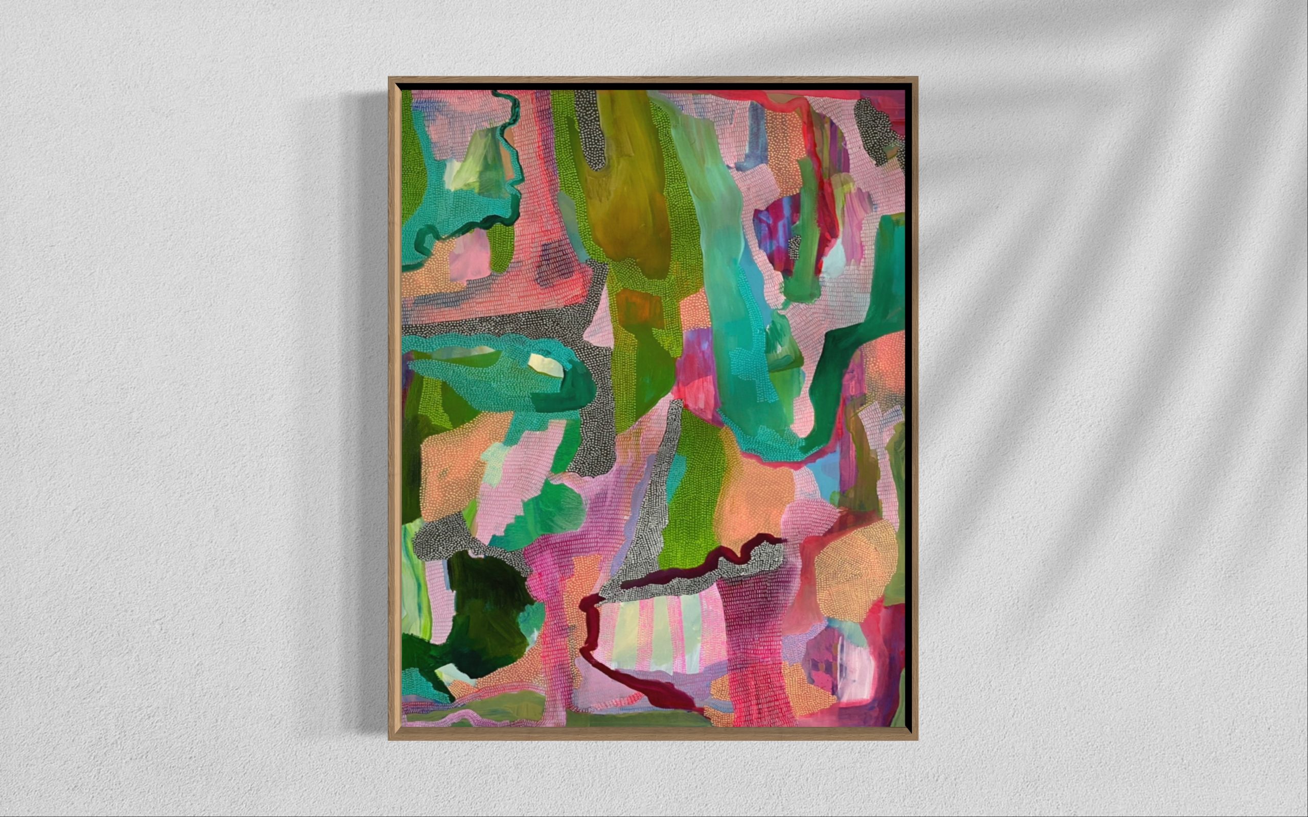 This is an undeniably bright painting with bold areas of fluorescent pink and green. These pops of colour are tempered with darker blues, purple and magenta as well as areas of blush, turquoise baby blue and orange. Whilst a vibrant painting, the mixture of different tones and the pattern layer tones down the overall feel of the work, making it more adaptable and livable. Despite the bold colour it also feels very soft.