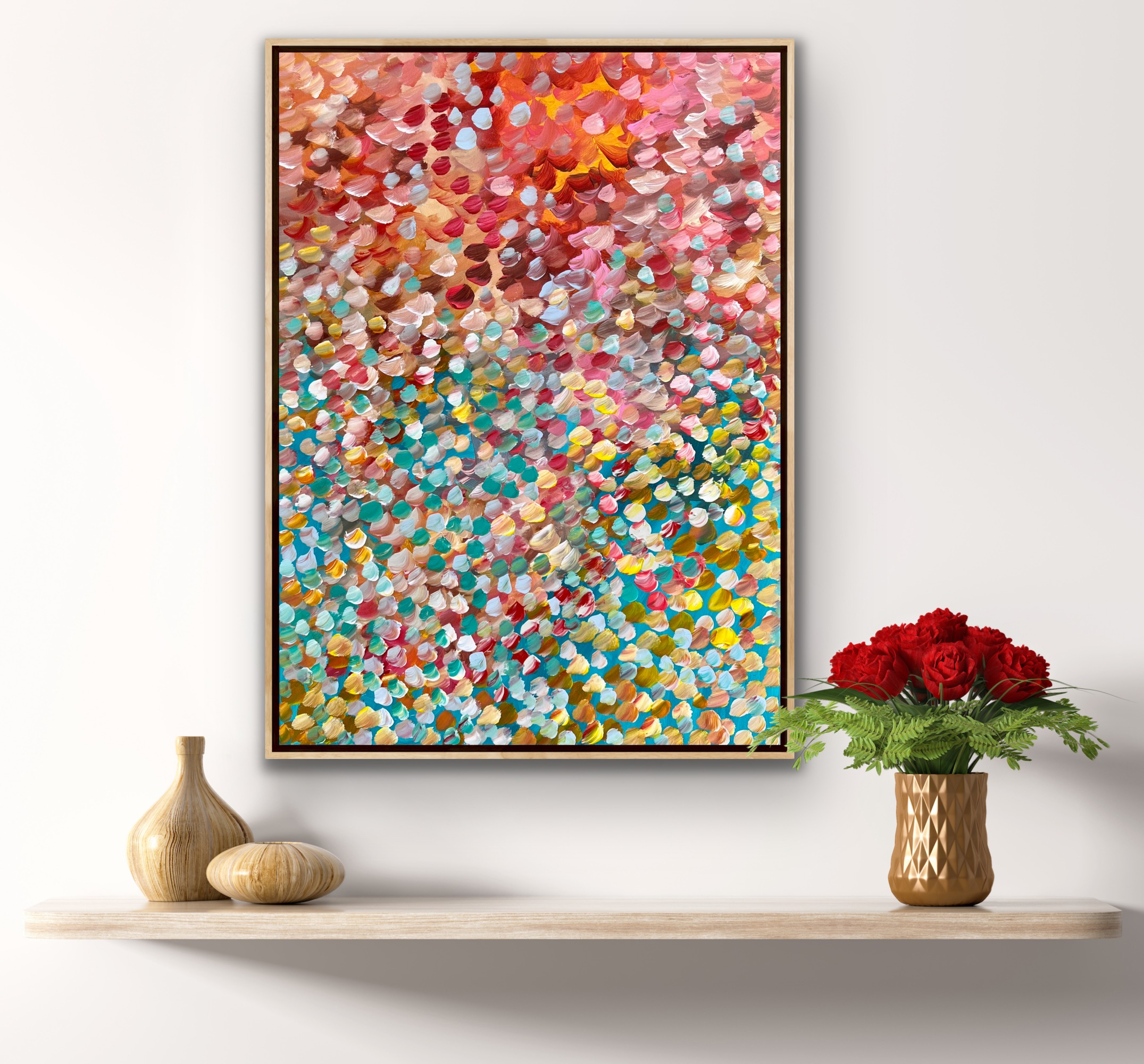 I gave you my heart by Theo Papathomas – a painting with warm and cool colours of the petals flying in the wind creating this beautiful bouquet of petals in the sky with lots of layers of paint . Flickering petals dancing in the sky like shining stars . Petals weeping onto the landscape creating this veil of petals covering the sky with lots of layers of colours . A composition of colours and rhythms of petals dancing like musical notes creating fireworks in the sky . A very peaceful and tranquil painting with so much depth. The painting does not come with an external frame.The painting is signed and dated 2022 at the back and comes with a certificate of Authenticity.