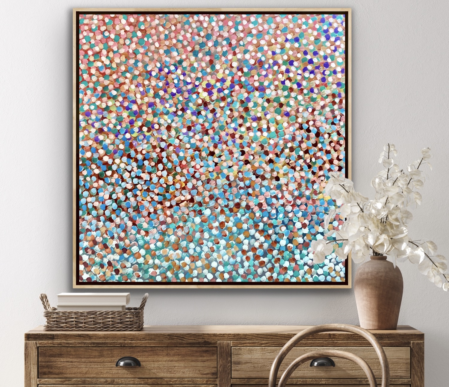 I gave you my heart  by Theo Papathomas -a painting with warm autumn colours of petals flying in the wind creating this beautiful carpet of petals in the landscape with lots of layers of paint. Beautiful flickering petals dancing over the land shining like stars. Petals weeping onto the landscape creating this veil of petals covering the landscape with beautiful autumn colours . A composition of colours and rhythms of petals dancing like musical notes over the land . A very peaceful and tranquil painting with so much depth. The painting does not come with an external frame.The painting is signed and dated 2022 at the back and comes with a certificate of Authenticity.