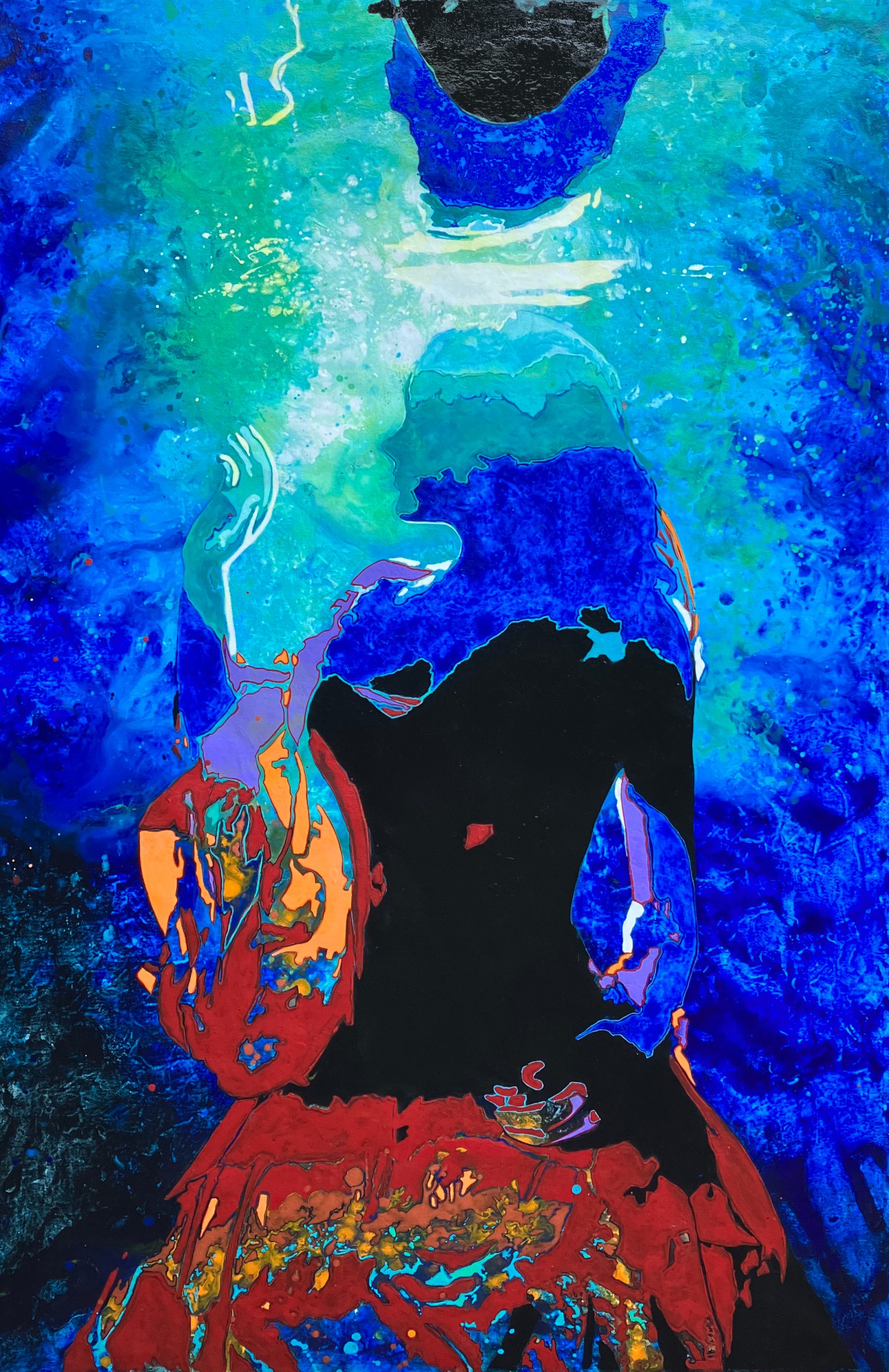As with most of Kerry’s paintings, she has painted in layers. The background using action painting (expressionistic) techniques – pouring, dripping, splashing paint and involving my body in the painting process rather than just the paint brush. The figure was created using contemporary art pop art techniques and stencils, and a further layer of hand painting brought the foreground and background together. Kerry’s palette is colourful and uses strong contrasts to capture a mood of strength.
