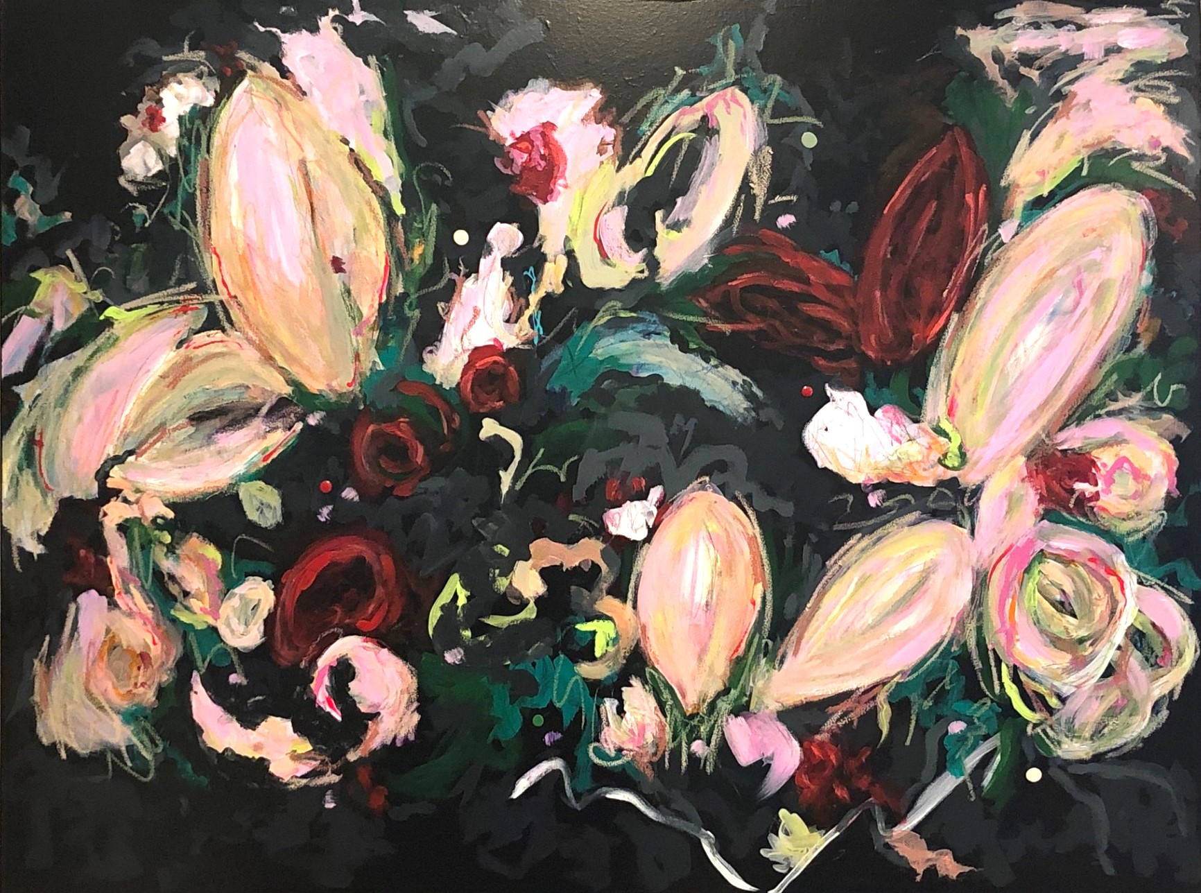 This piece is both bold and ethereal, inviting the viewer to lose themselves in its lush, painterly textures. Perfect for those who appreciate contemporary floral abstraction with a dramatic edge.