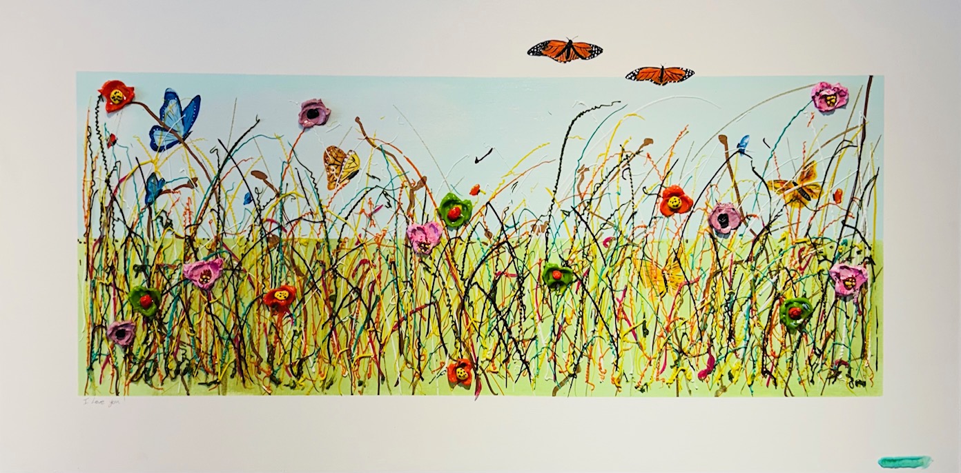 “I Love You” is a stunning 120cm x 60cm textured artwork that radiates charm and romance. The piece features a lush grass background brought to life with thick, chunky flowers in vibrant hues. Delicately placed blue and orange butterflies flutter across the scene, adding movement and grace, while touches of gold leaf create a luxurious shimmer that catches the light beautifully.