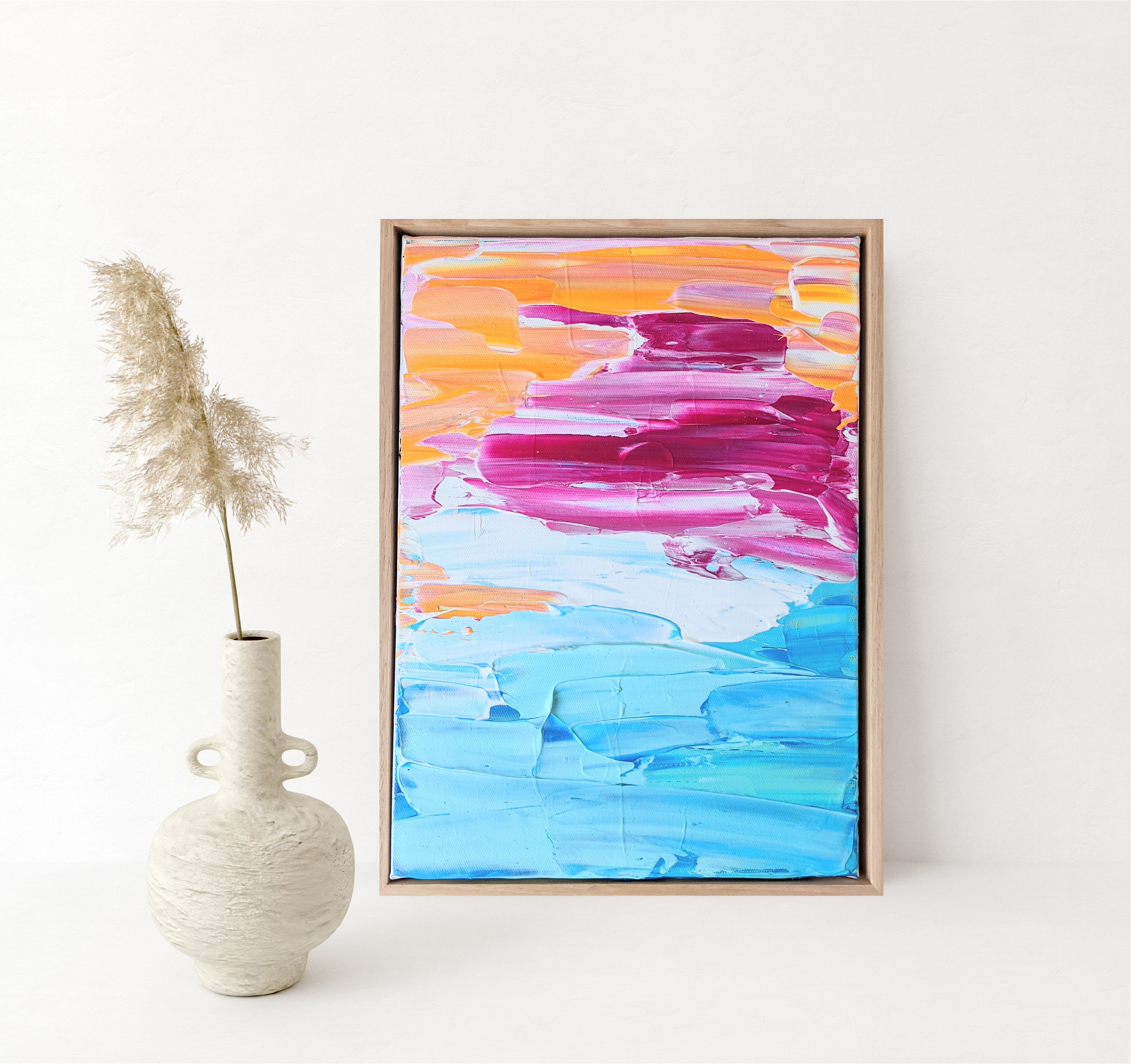 This artwork was inspired by my love affair with the ocean and it’s ever changing colour palette of blues and greens with the pink of a sunset at the end of a beautiful day…