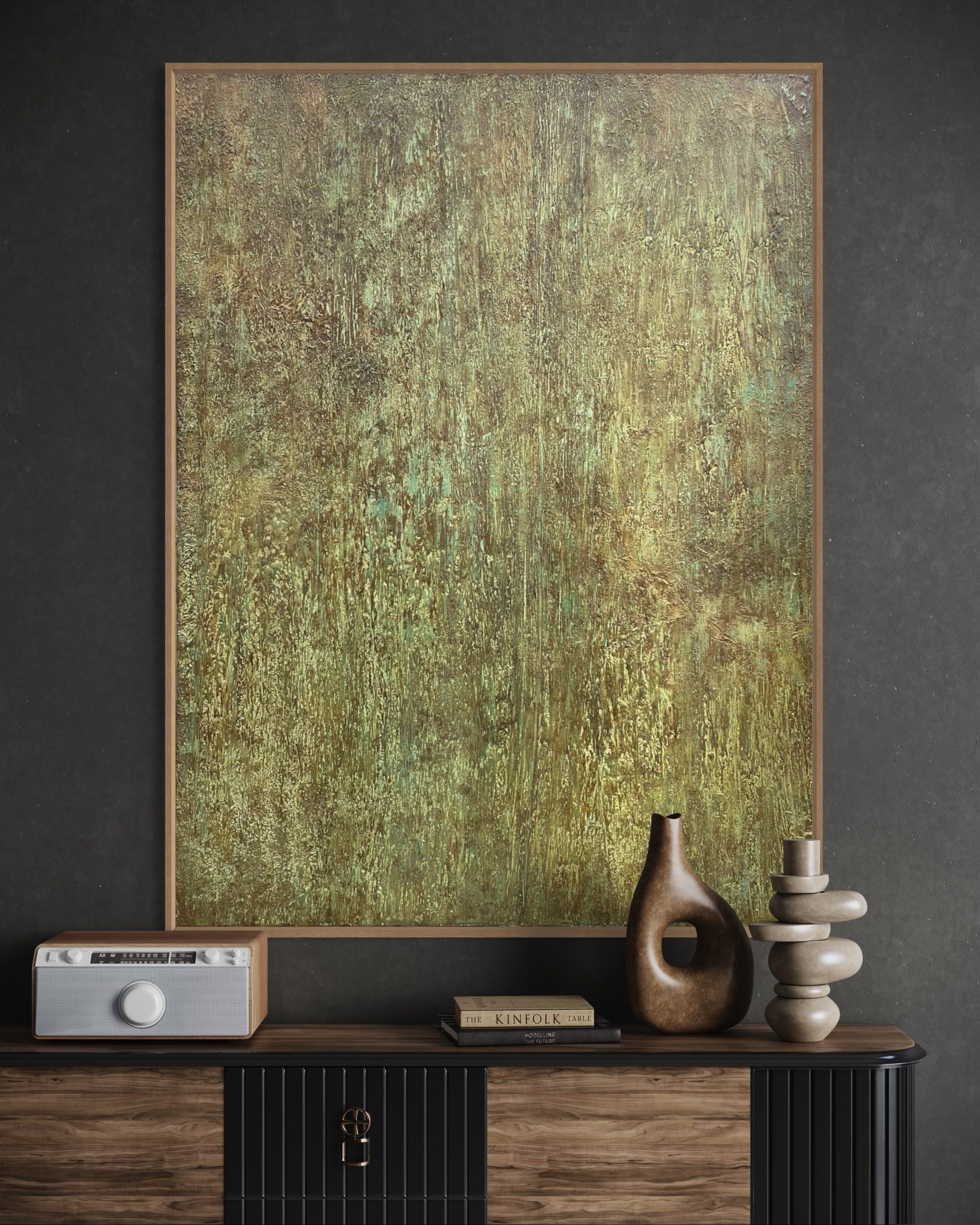 I Speak For The Trees by Nadine Hobson – Â is a textured abstract artwork on canvas. It features vertical texture in varying shades of greens, browns and a hint of blue which creates an earthy effect and is reminiscent of tree bark. Inspired by the old growth forests of the Dandenong Ranges where Nadine grew up, this statement piece emits a quiet strength and brings a little piece of the outdoors in. Framed in a raw oak float frame with title and signature on the back.
