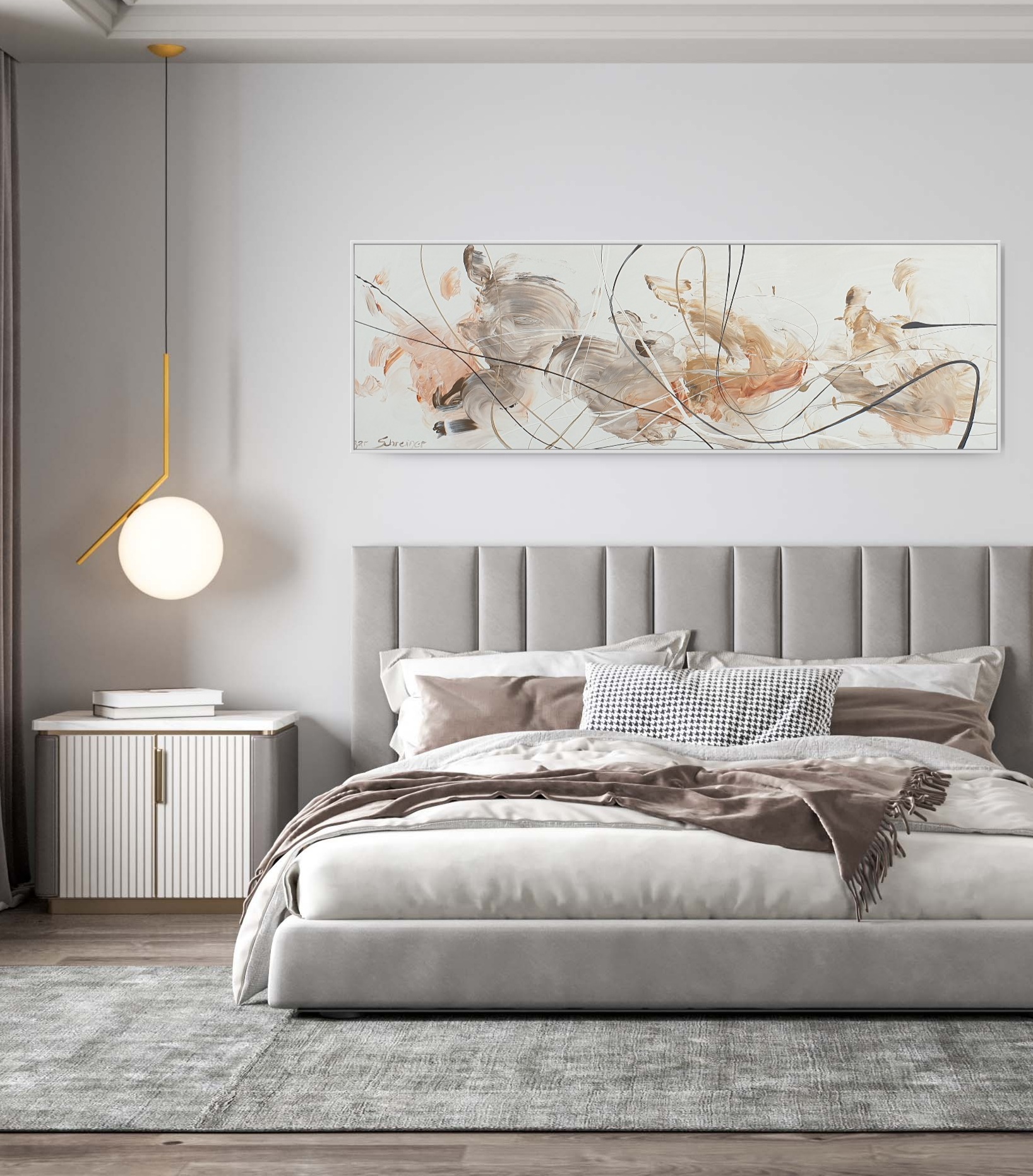 The painting doesn’t come with the external frame. The images attached are representations of what it could look like after being framed. No hanging wire.