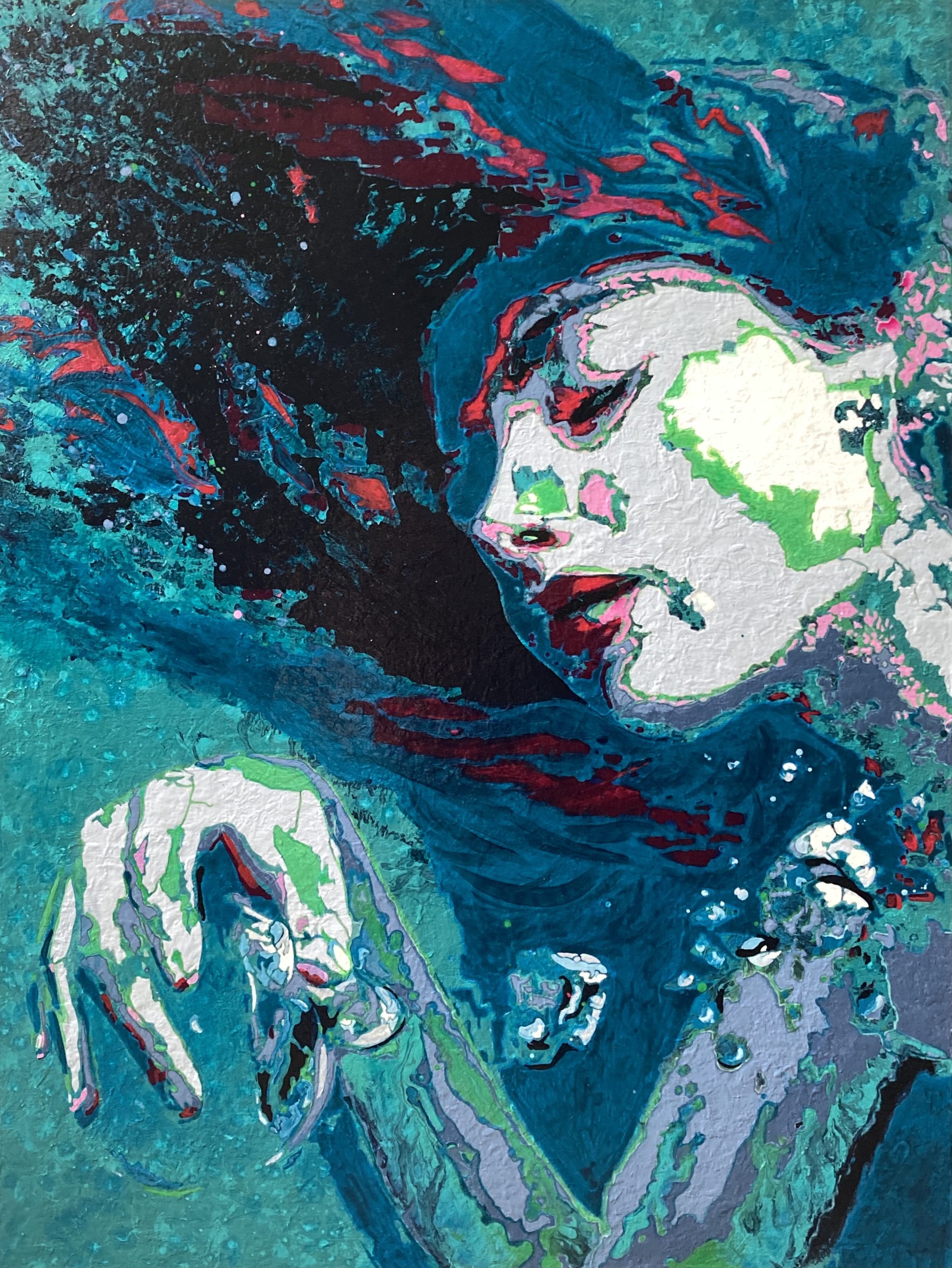 I work from created and found photographs and film stills. In this image I was particularly taken with the way that the model looks suspended in time, as if pausing, and extraordinarily holding a bubble that is slowly diminishing by releasing smaller bubbles through the water. It lead me to think of Emily Dickinson’s poem “I took my Power in my hand” – a poem about taking on both David and Goliath, but failing. It reminded me that at times in life we give something everything we’ve got but sometimes it’s just not enough. Despite this, we go on, we live another day safe in the knowledge we did our best. Regathering and restrengthening . I wanted to capture both her strength and her vulnerability using bright contrasting colours of teal and a beautiful red magenta. I have developed my style using contemporary art techniques such as expressionism and pop art. I love to give the surface of the painting lots of texture and shine, creating a sense of movement.