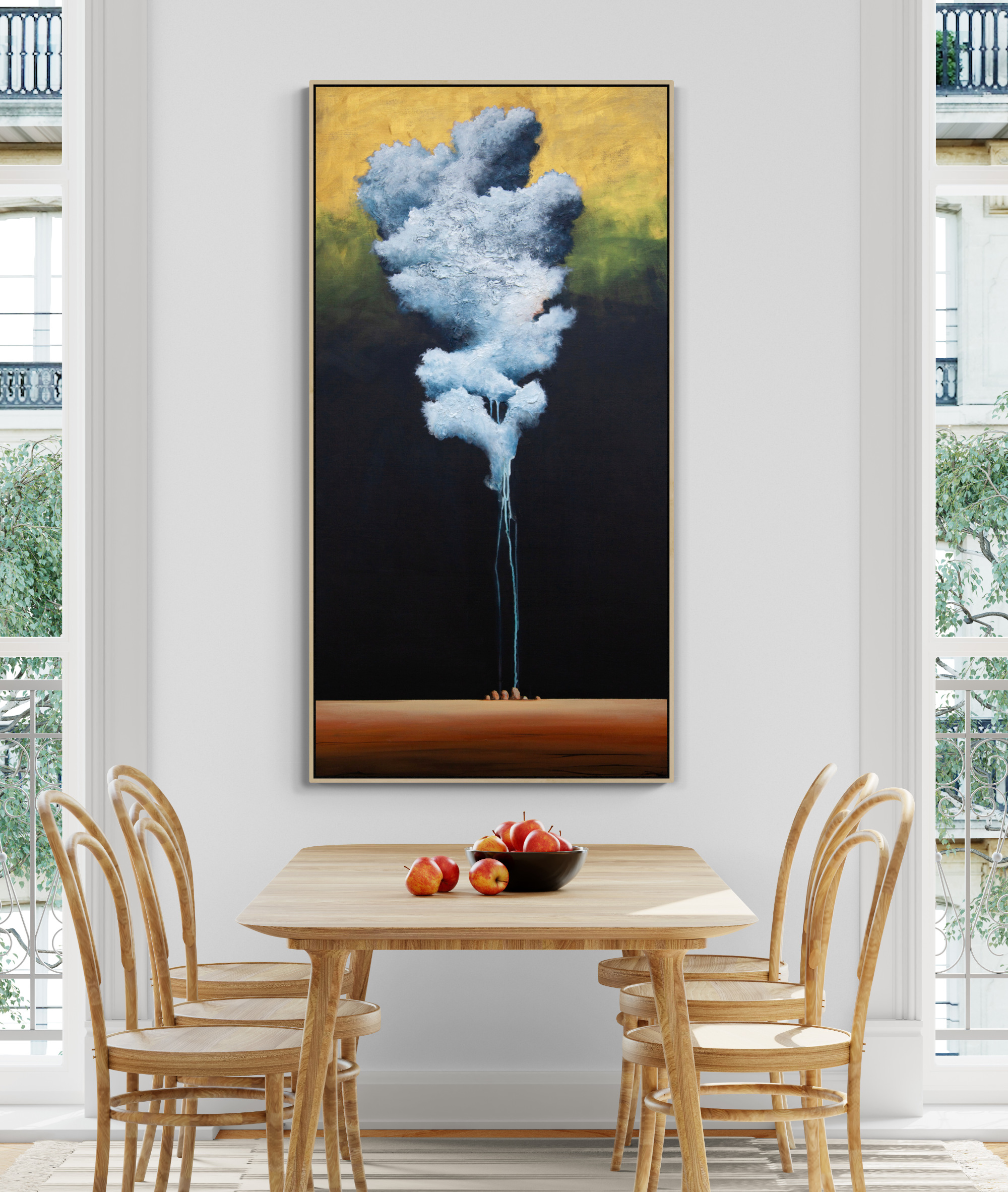 In this textured abstract cloudscape painting, the sky is a canvas of ethereal wonder. The cloud, rendered with textured strokes, comes alive in swirling wisps and billows, creating a sense of movement and depth. This singular tall billowy cloud commands attention. It rises majestically, its form imbued with a sense of grandeur and presence. Its edges are defined by intricate layers of texture, revealing the interplay of light and shadow, as if the cloud were a living entity, ever-changing and full of character.