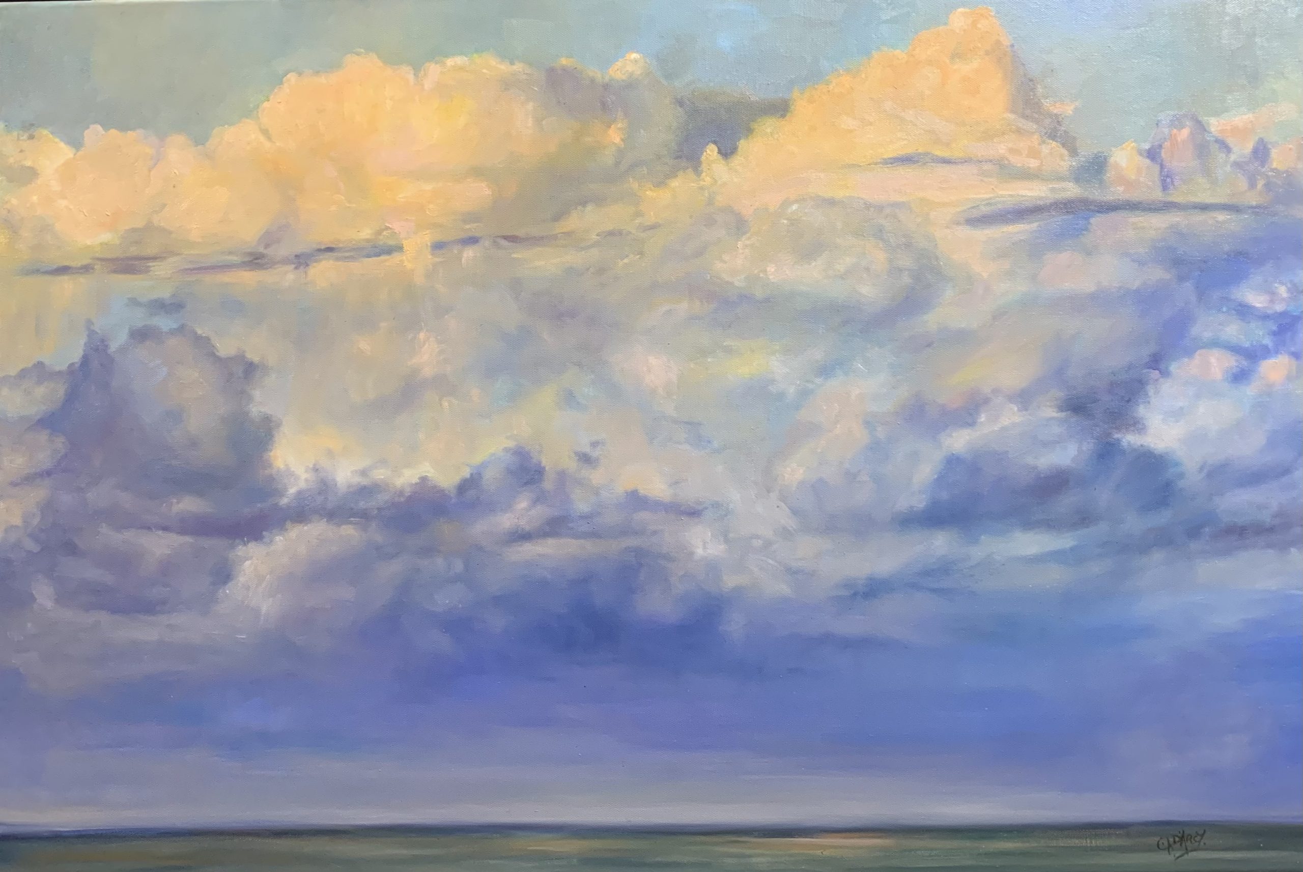 Ice cream Castles in the Sky by Carol D’Arcy – Inspired by the setting sun over the ocean, a moment which took my breath away, as the drama unfolded and the storm clouds  off shore were lit up as if aflame. As the title suggests, the drama and beauty, was only a moment, before it subsided and calmed itself for night sky. Highest Quality linseed oil and oil paint. Unframed.