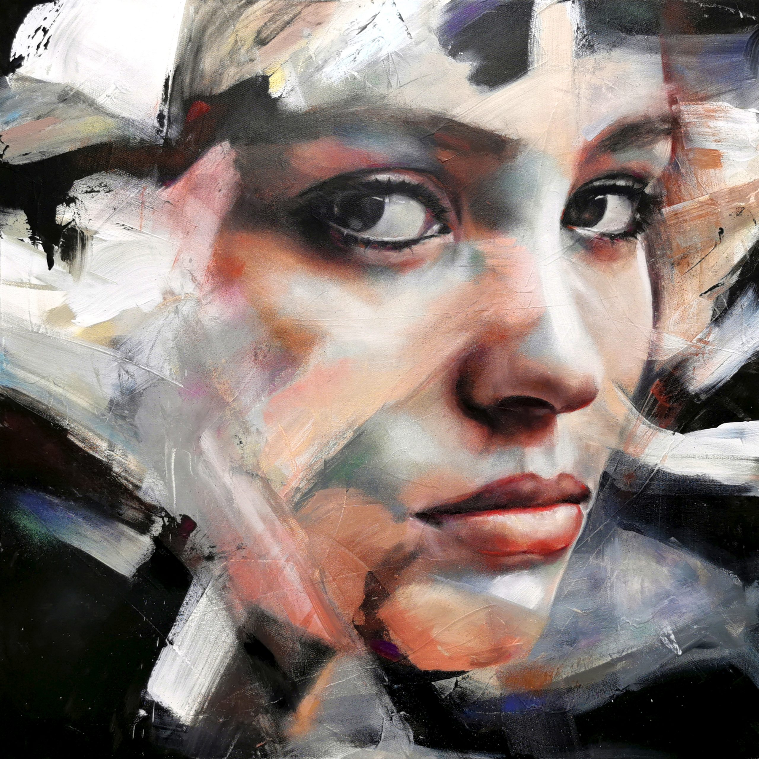 “If Time Stood Still” by artist Stuart Ross. Stylised portrait piece of when realism meets abstraction. It’s a balance of light and dark, clarity and uncertainty, beauty and distress.