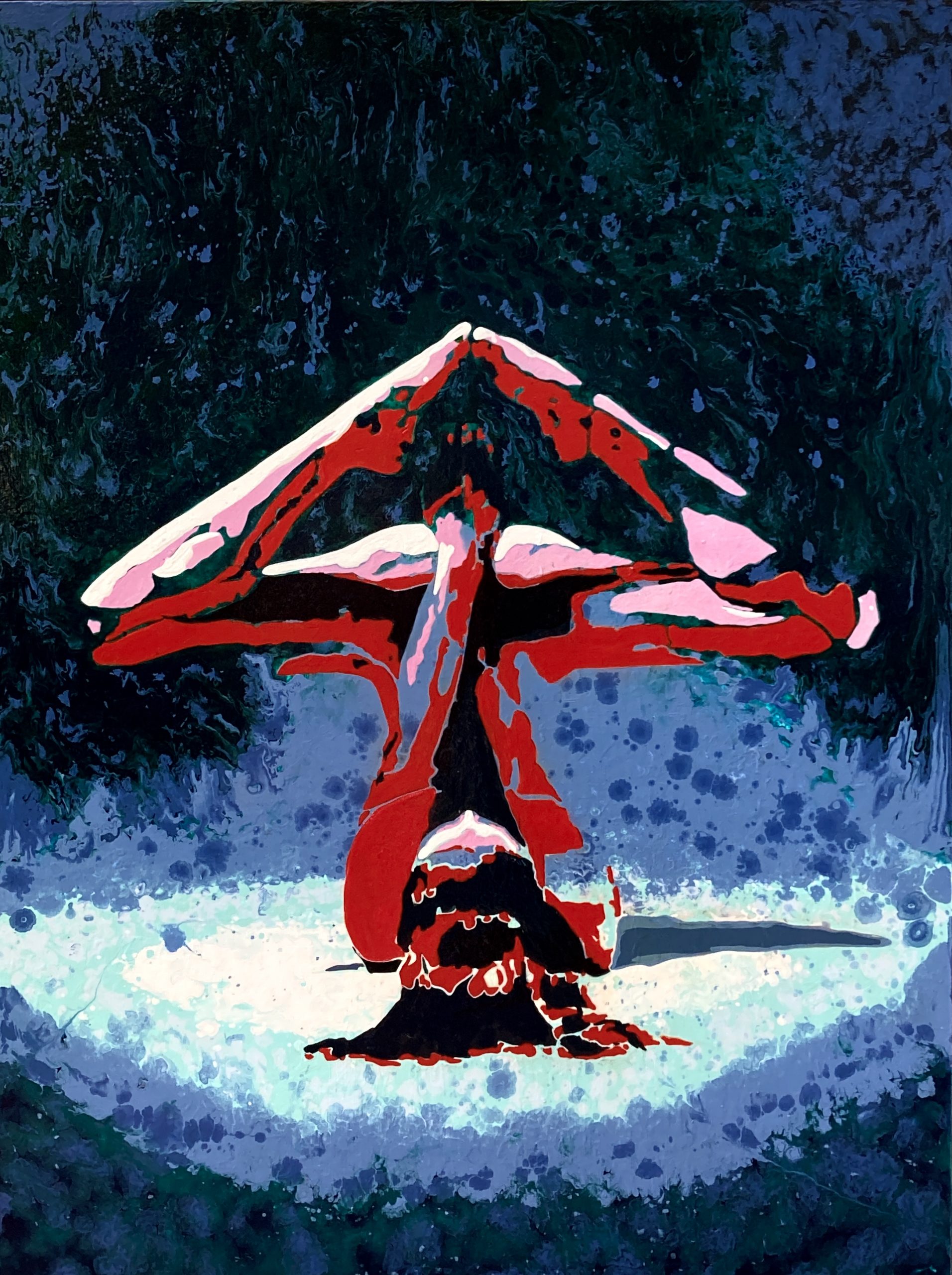 I am a yoga teacher as well as an artist, so this particular posture appeals to me in the fact that I find it visually pleasing, and I can also appreciate the difficulty of the pose. This pose is not accessible by most and is a most impressive version of Candle Pose – also known as Queen Pose. As I am all about female empowerment I love to see beautiful and powerful form in women. I was struck by the almost crossbow look of the pose and wanted to translate this into colour. I have used a bright red to define most of the form – this bounces off the bluey purple and dark green background, creating a strong contrast. I have developed my style using contemporary art techniques such as expressionism and pop art. The resultant painting is a wonderful reflection of feminine strength. Named after an Emily Dickinson poem, Dickinson refers to heroism and choosing to be strong.