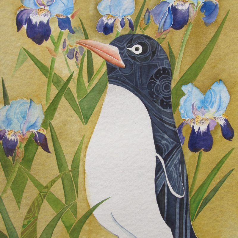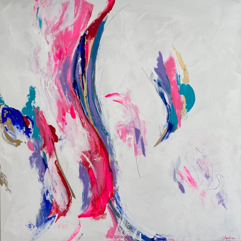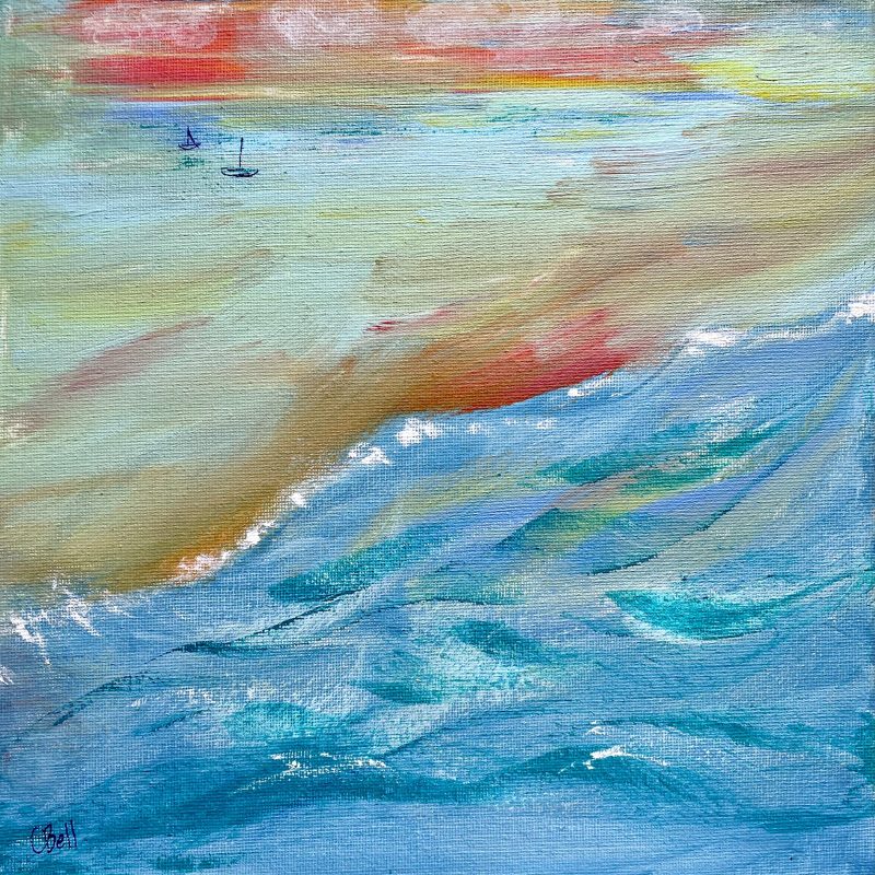 This painting is painted using professional artist acrylic paints and mediums from Matisse, Golden, and Liquitex Professional Spray Paint. Golden Self Levelling Medium has been painted onto the canvas prior to painting the image – creating texture and an impression of movement to the surface of the painting. The painting is finished with a Satin Varnish which protects the surface with a satin finish.