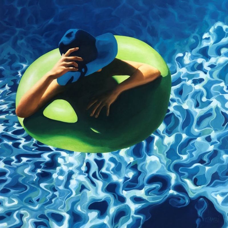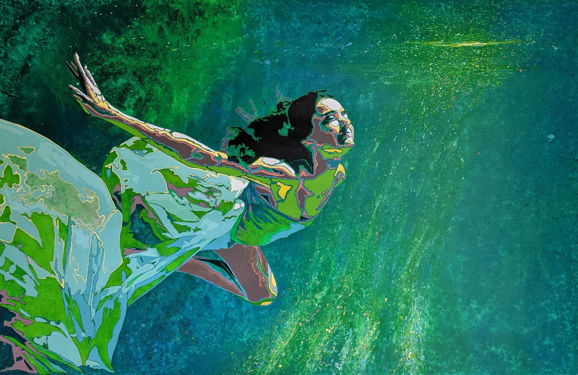 Kerry seeks uplifting images and motifs to capture inspiration in her art, and when she came across this image she was taken by the motion of the woman swimming forward into light. With the models hair and dress flowing behind her, she swims through her underwater world, lifting her head and basking her face in the light. The bold blue-greens and contrasting orange gives a sense that this woman seeks out joy and adventure in her life. An uplifting message for any person looking to live beyond the ordinary.