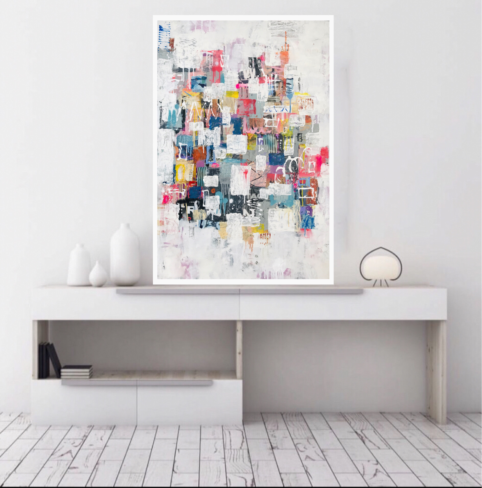 The Painting has a very textured finish created by built up layers, a visual effect mimicking the look you would see in the street where this effect is created over time on Graffiti Walls & Advertising Spaces. These imperfections are part of the overall look and feel of the finished work. Insitu examples are not to scale.