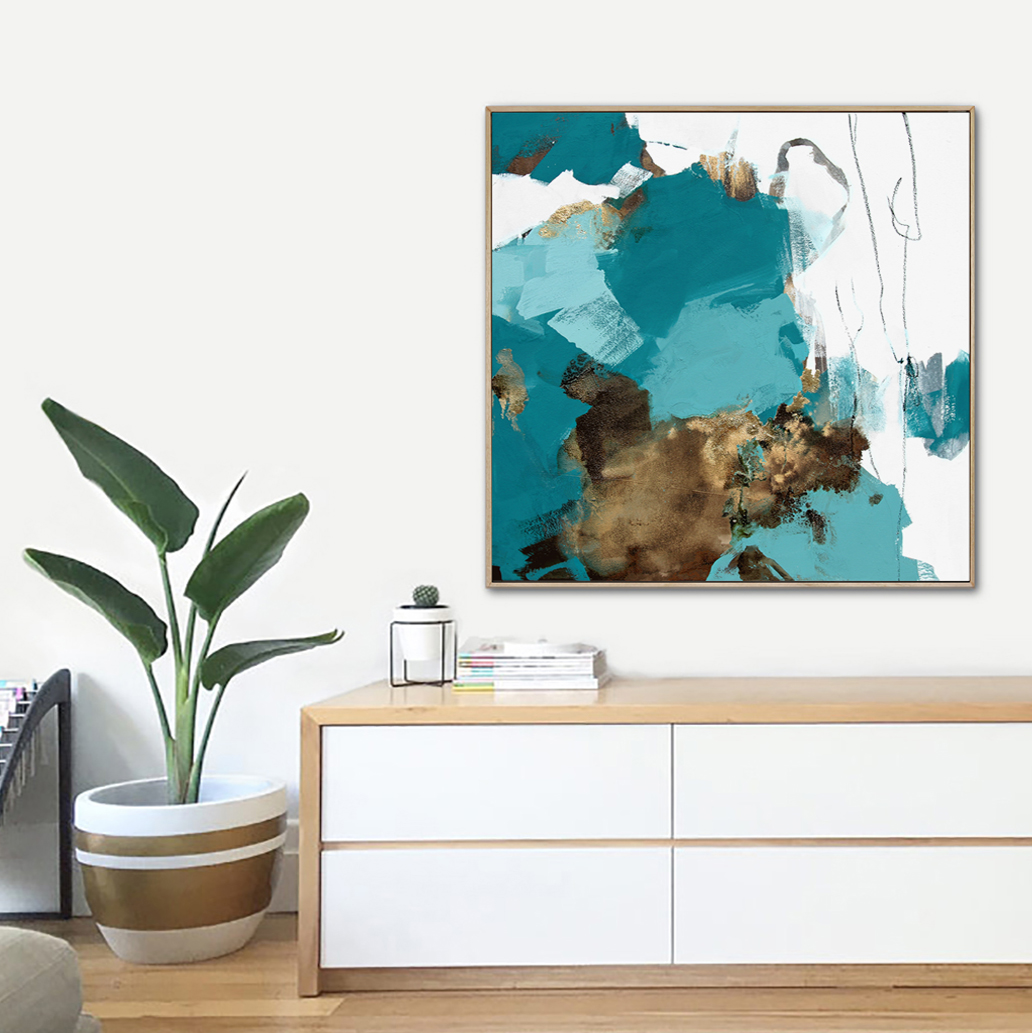 Ilaria is very textured and is a combination of teals, greys, browns and gold. The painting extends around the 3.8cm sides of the canvas so it’s ready to hang. An oak floating frame (as in room images) can be included for an additional $260.