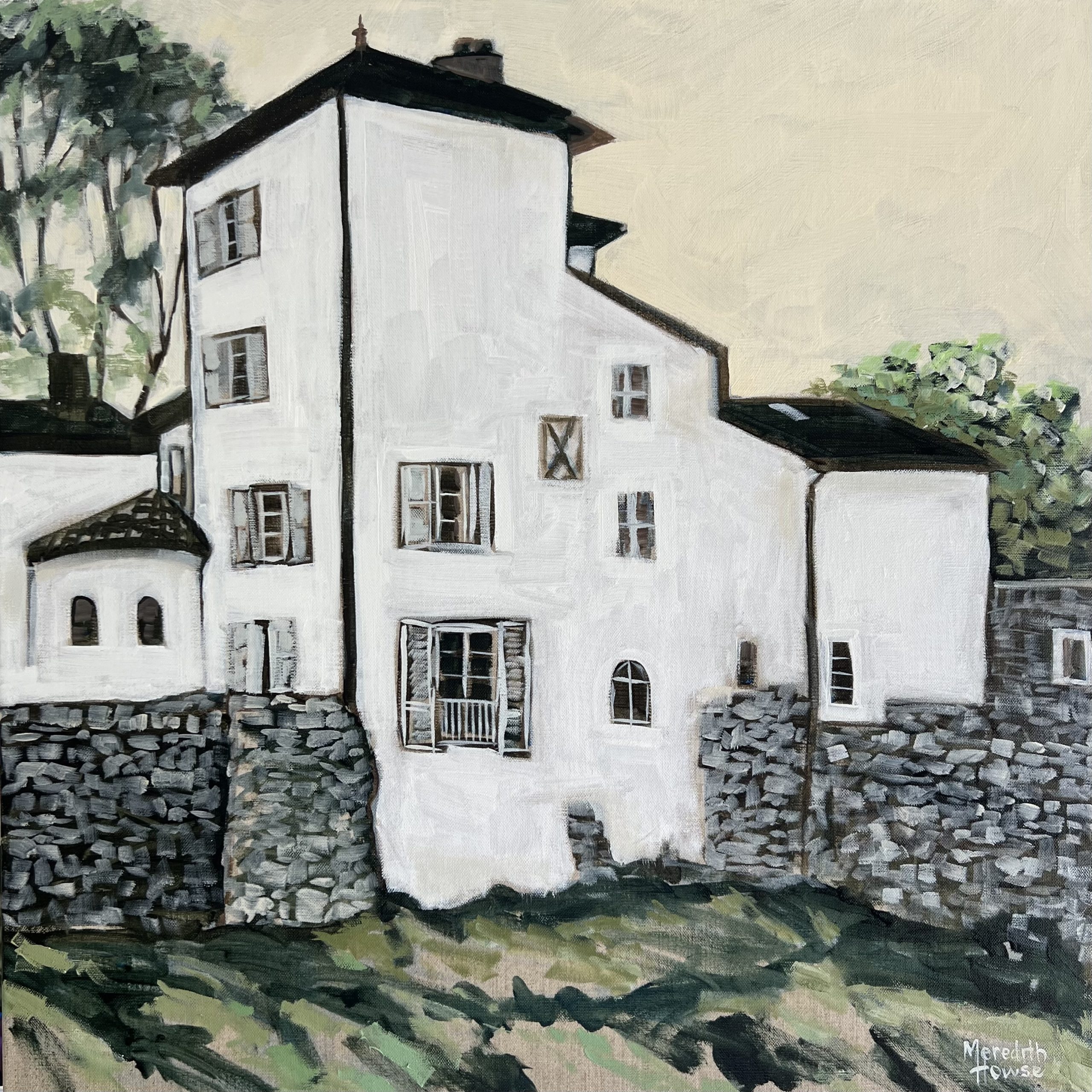 Ile Barbe, Lyon by Meredith Howse is a contemporary stylised oil painting on linen by Meredith Howse. Showcasing historic French architecture of the Saone River in Lyon, France.