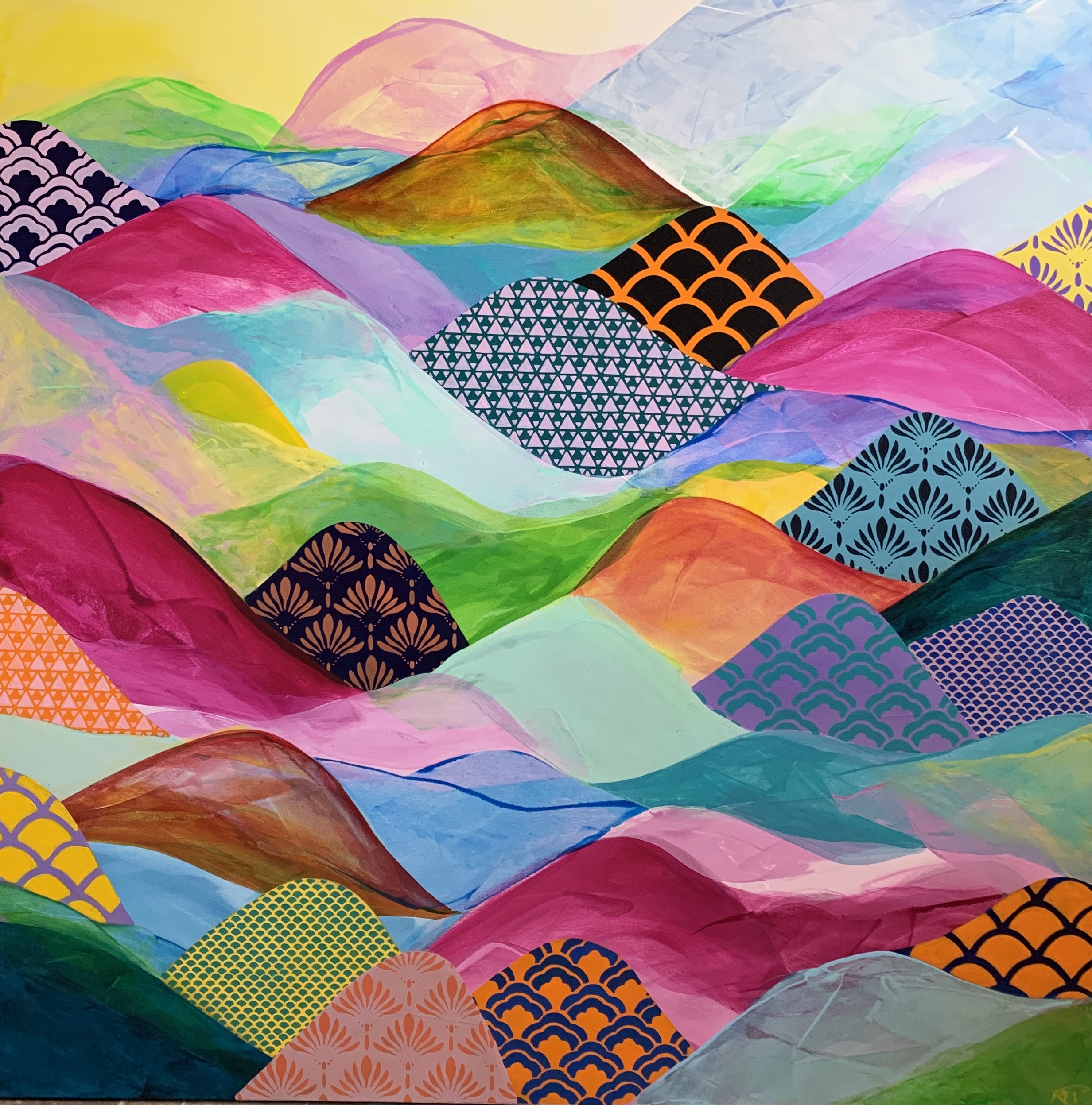This extra large scale canvas represents my interest in shape, pattern and the use of vibrant hues in the production of artwork. The base layer has been built up with the use of a catalyst wedge followed by more deliberate brush work to define the mountain like shapes. Opaque layers of paint have been applied over some of the shapes to increase interest and draw the viewers eye. Finally, stencilling has been added, further enhancing aesthetic appeal in the work. I have titled this artwork ‘I’ll Meet You at Rainbows End’ because it represents to me a vision of a mountainous scene at the end of a rainbow.