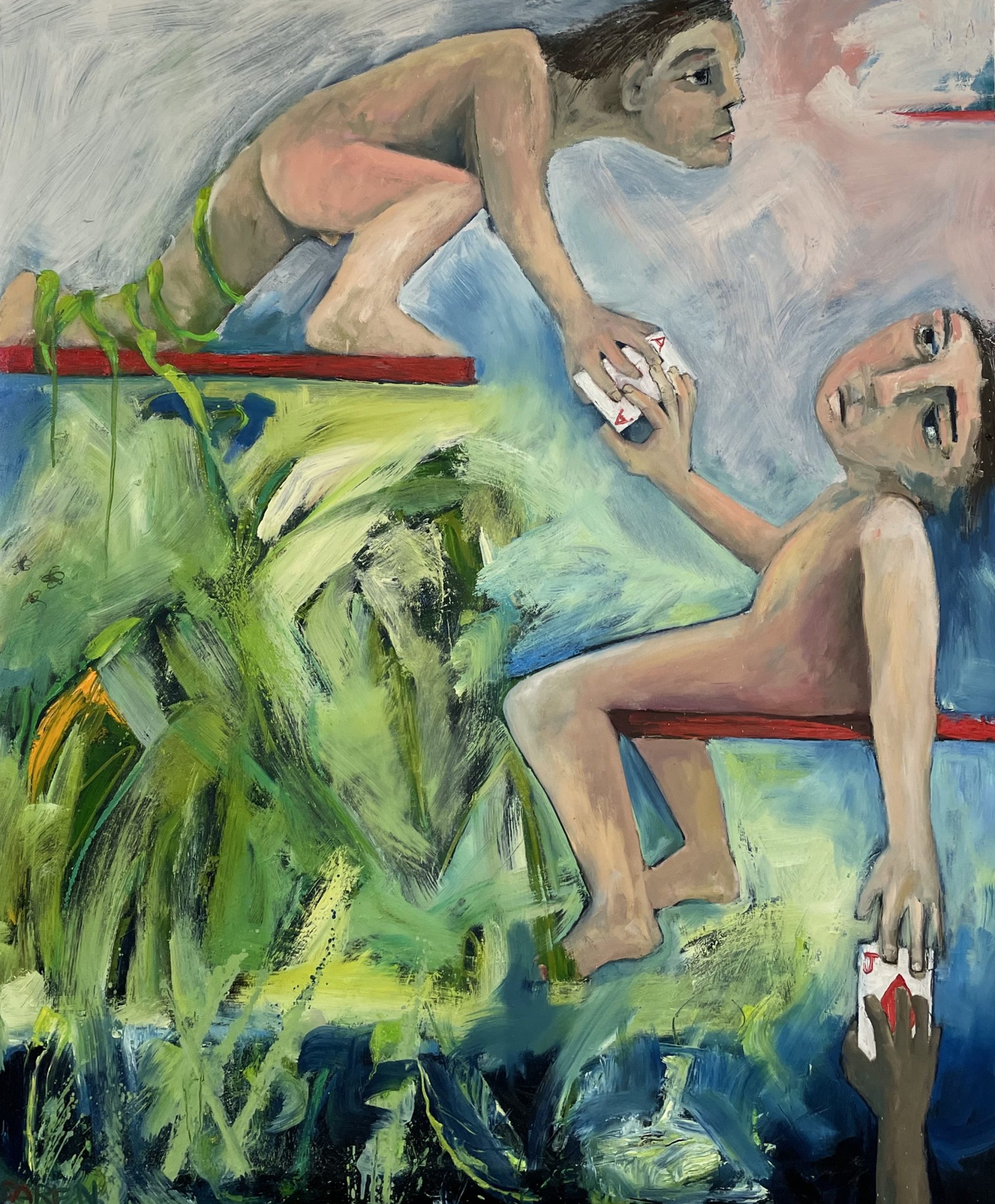 I’ll Raise You by Saren Dobkins – is an exploration of naked ambition. The composition features two figures suspended on the rungs of a ‘ladder’, and one reaching up, each intent on elevating their status. The playing cards symbolize the gamble we take on ourselves, despite the imposition of a centuries-old social order characterized by entrenched unfairness. This piece captures the continuous negotiation between those who have and those who need more.