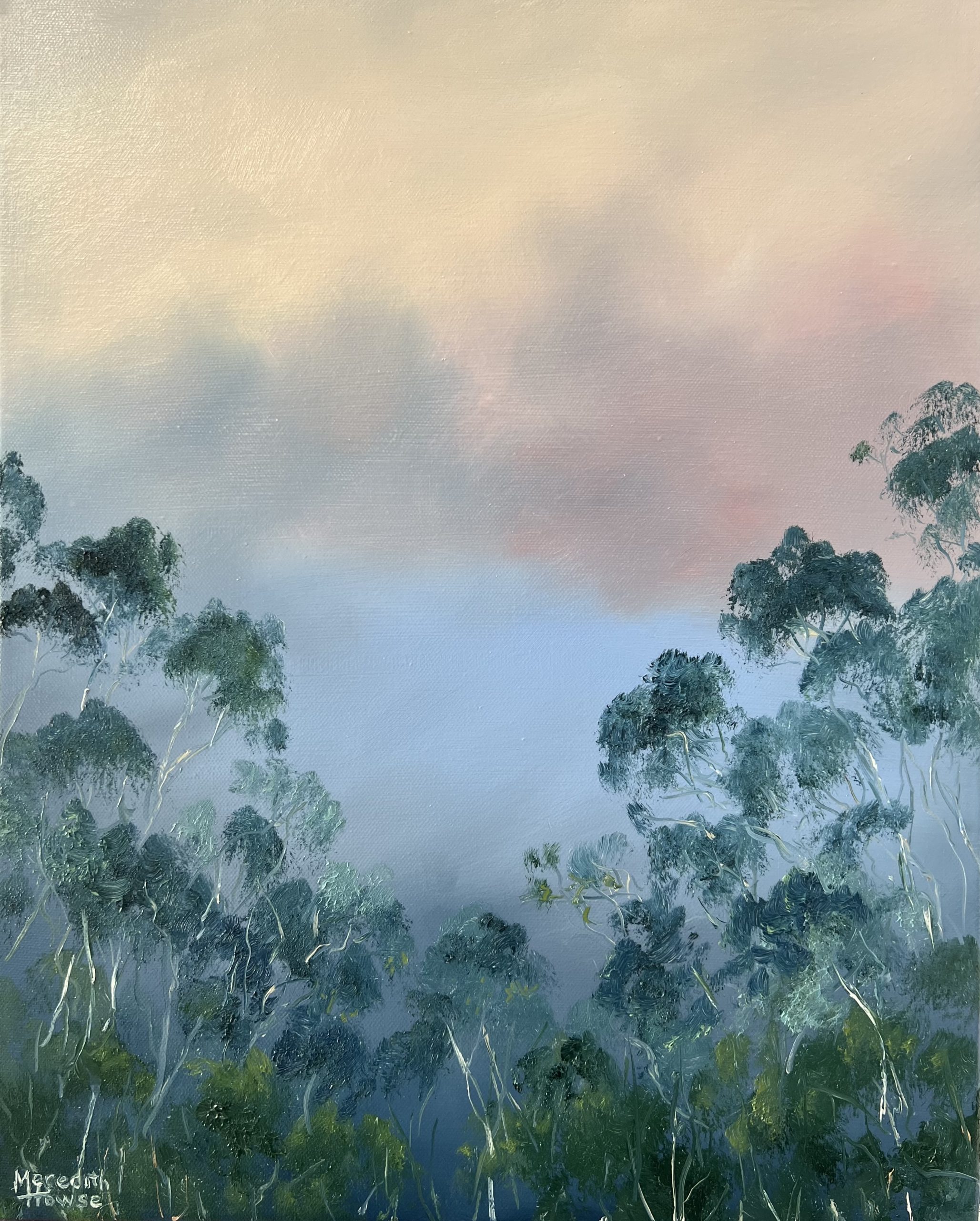 Illumination Australiana by Meredith Howse is an artwork inspired by the awe-inspiring beauty of a distant summer storm, capturing nature, particularly the grandeur and majesty of towering trees. The artist uses a palette of pinks, blues, greys, dark greens, and gum tree blues to bring the scenes to life.