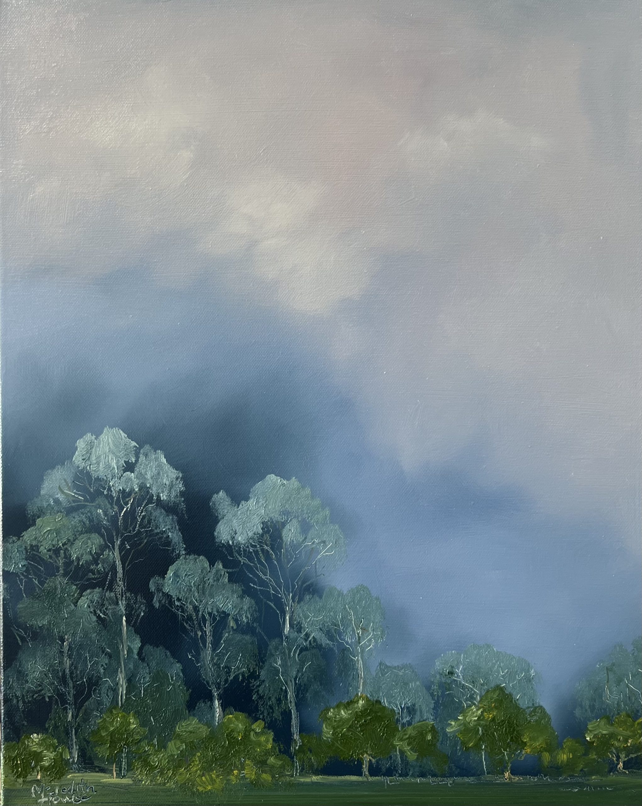 Illumination Centennial Park by Meredith Howse is an artwork inspired by the awe-inspiring beauty of a distant summer storm. Capturing the essence of nature, particularly the grandeur and majesty of towering trees. The artist uses a palette of pinks, blues, greys, dark greens, and gum tree blues to bring the scenes to life.