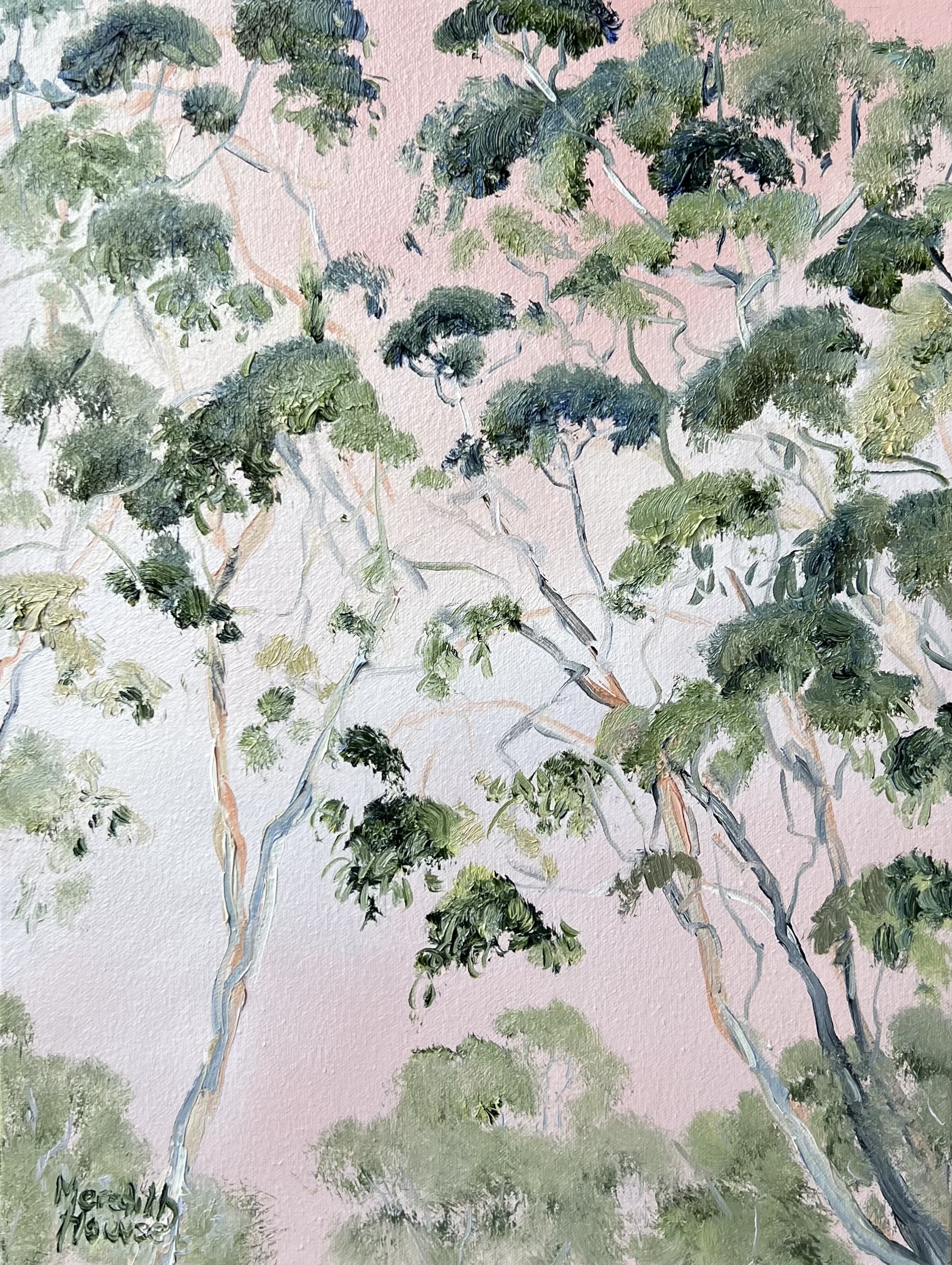 Illumination Gum Blossom Pink by Meredith Howse is an artwork inspired by the awe-inspiring beauty of a distant summer storm. Capturing the essence of nature, particularly the grandeur and majesty of towering trees. The artist uses a palette of pinks, blues, greys, dark greens, and gum tree blues to bring the scenes to life.