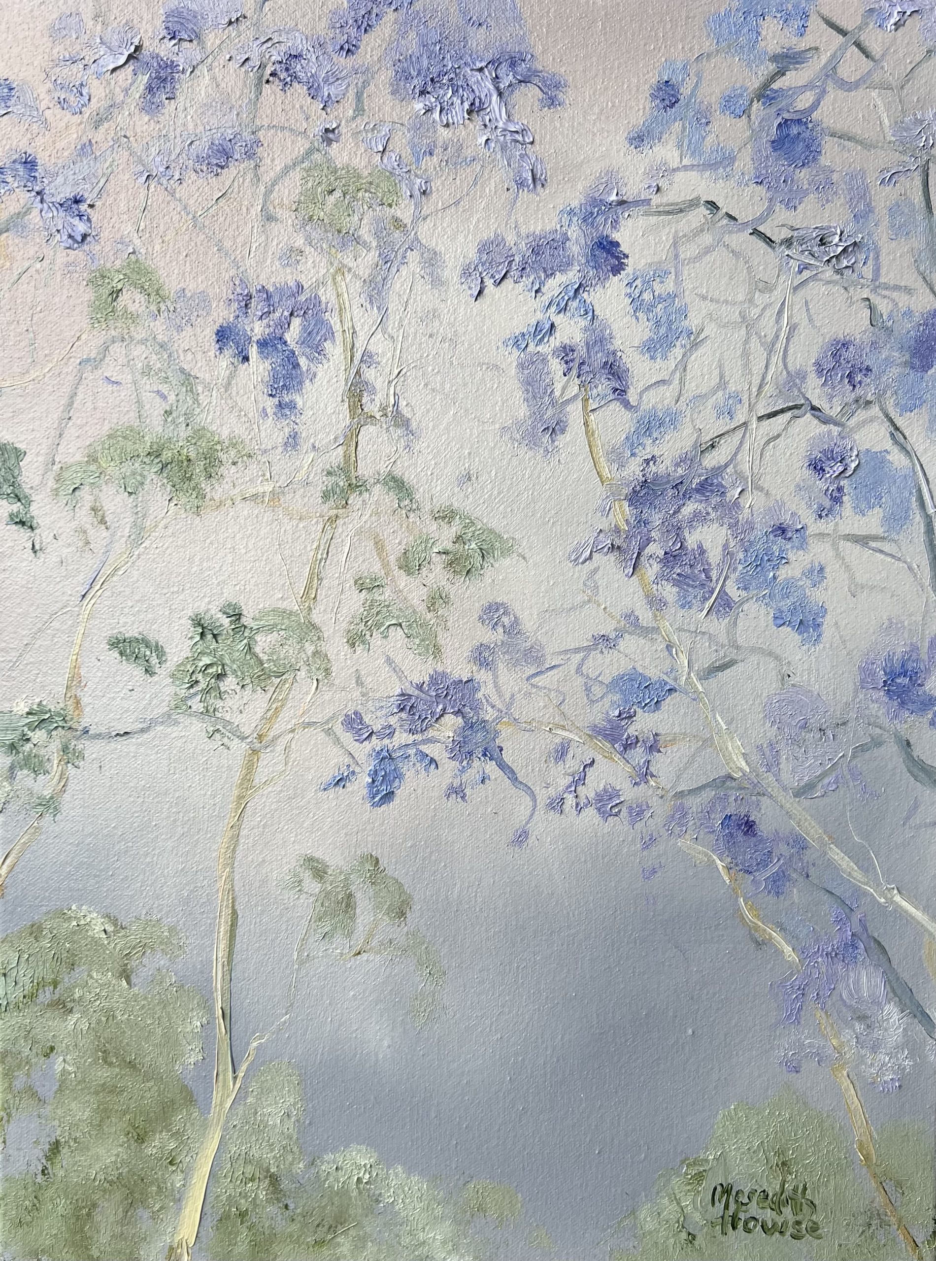 Illumination Jacaranda Blossoms by Meredith Howse is an artwork inspired by the awe-inspiring beauty of a distant storm. Capturing the essence of nature, particularly the grandeur and majesty of towering trees. The artist uses a palette of pinks, blues, greys, dark greens, and gum tree blues to bring the scenes to life.