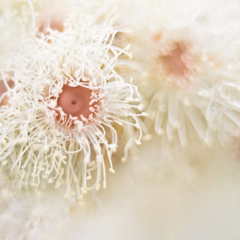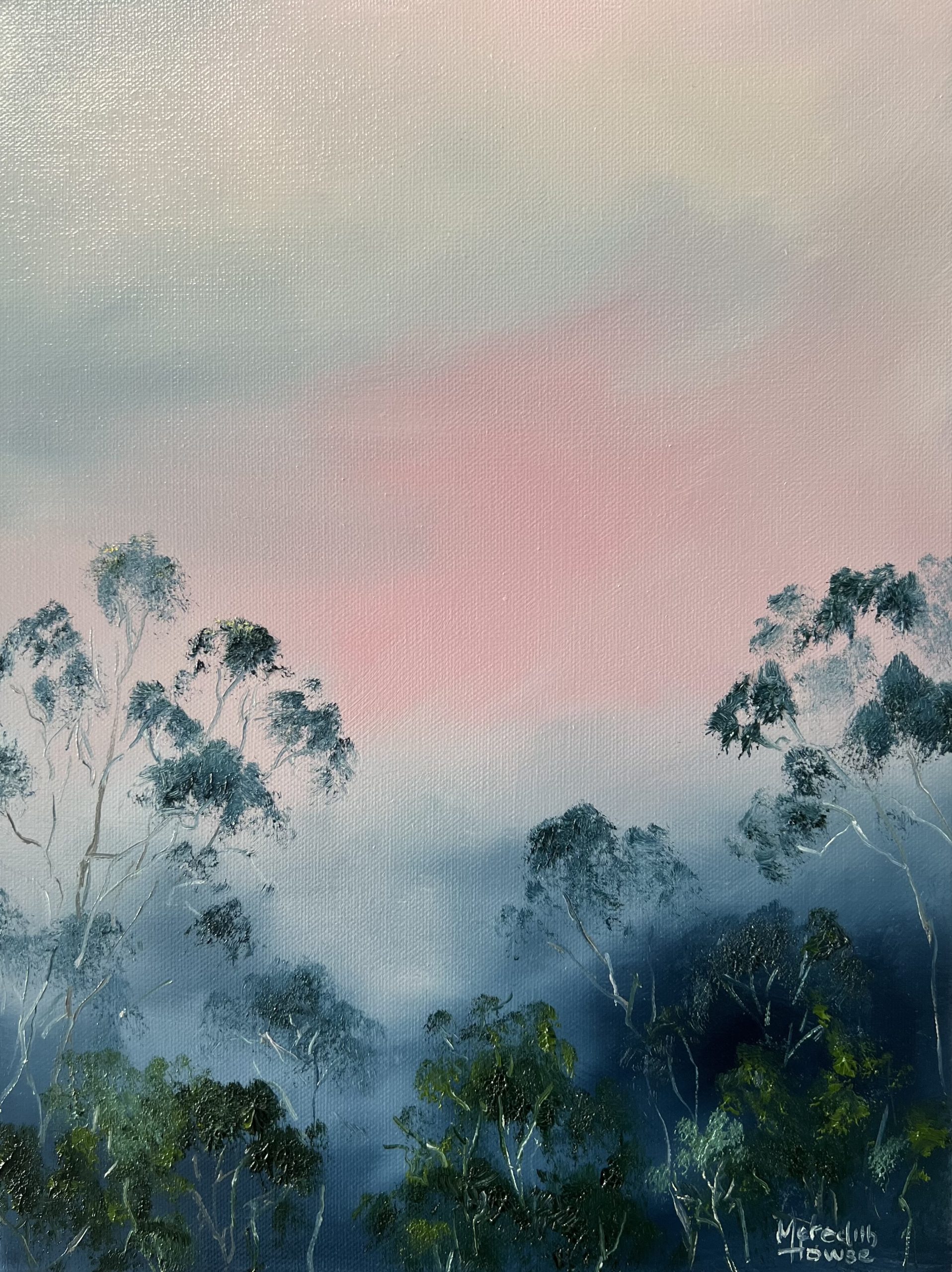Capturing nature, particularly the grandeur and majesty of towering trees. The artist uses a palette of pinks, peach, greys, dark greens, and gum tree blues to bring the ‘Illumination’ scenes to life.