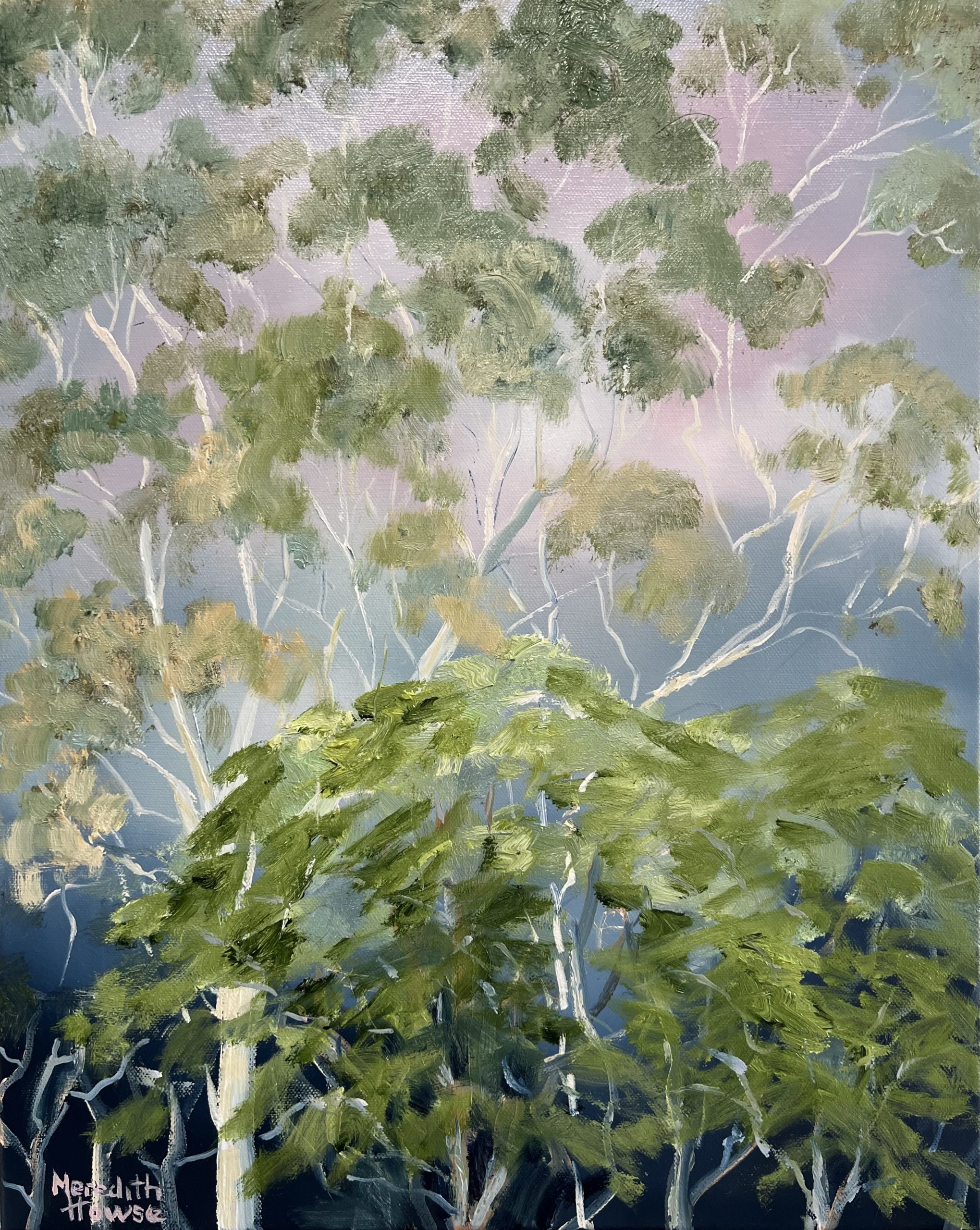 Illumination Night by Meredith Howse is an artwork inspired by the awe-inspiring beauty of a distant summer storm, capturing nature, particularly the grandeur and majesty of towering trees. The artist uses a palette of pinks, blues, greys, dark greens, and gum tree blues to bring the scenes to life.