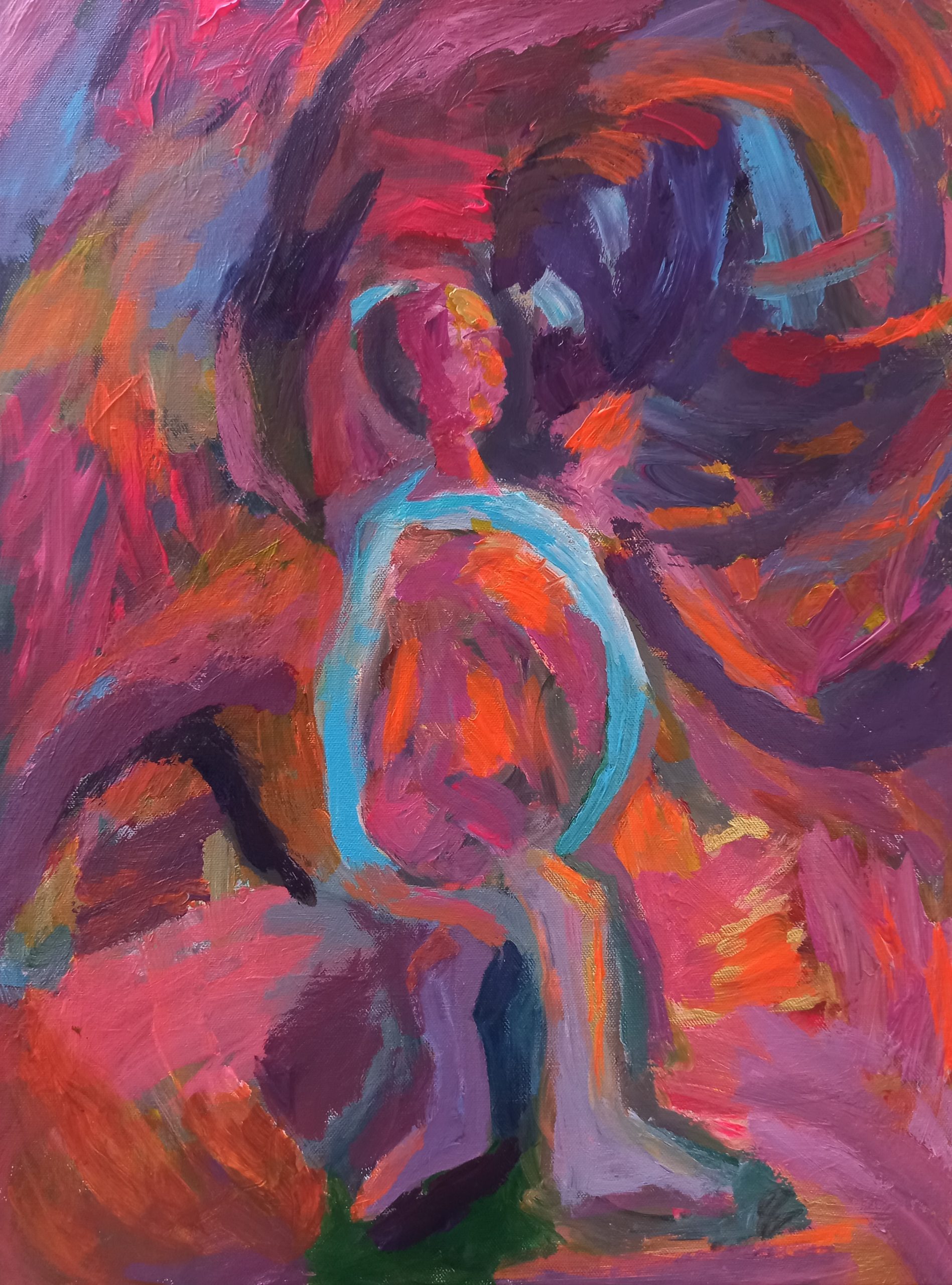 An ephemeral figure is in a sureal world of beautiful reds, blues, pinks, mauves, gold and glowing orange.