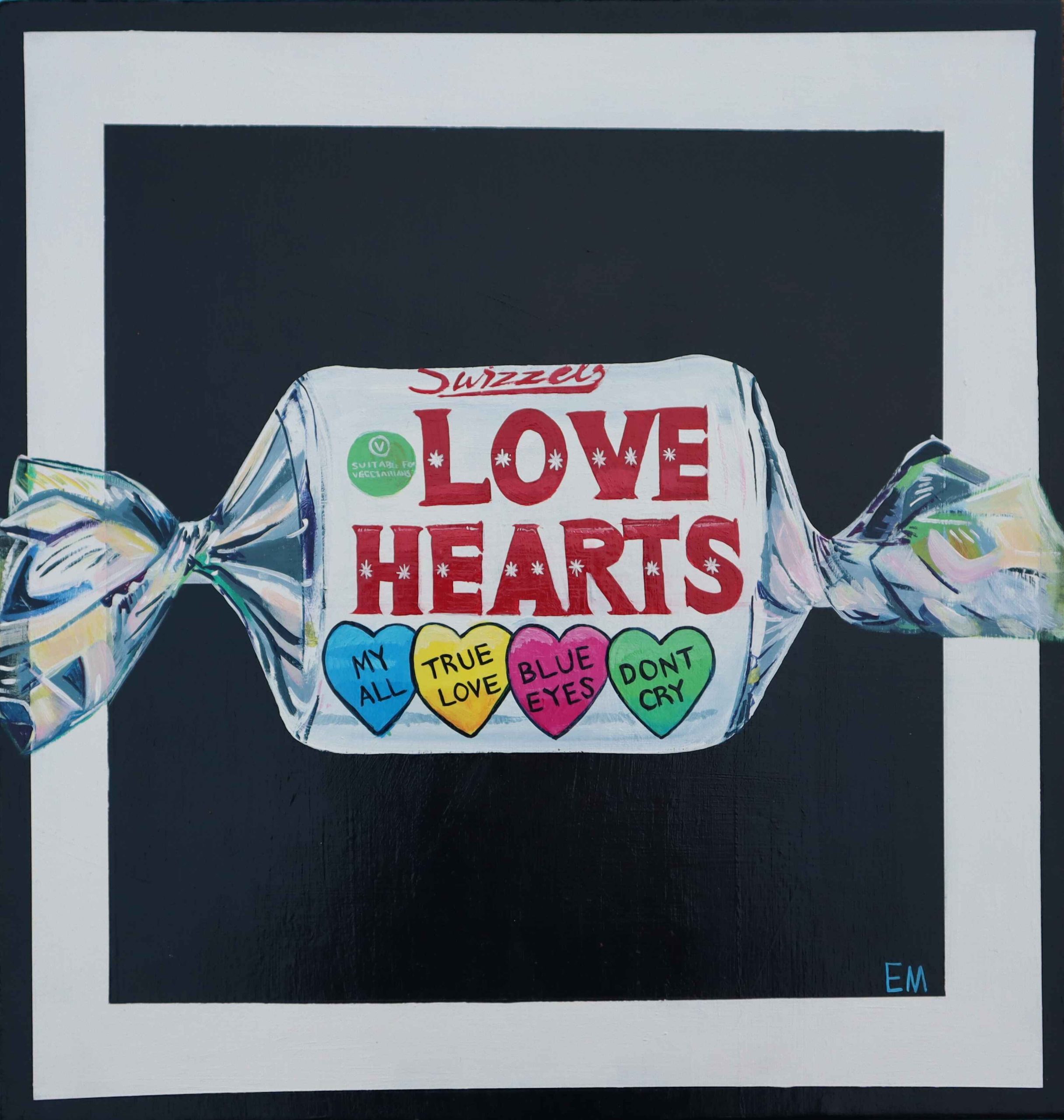 The oversized Love Hearts jump off the canvas to make a statement, the painting rolls over the edges of the paintings so that it displays well from all angles that it is viewed.