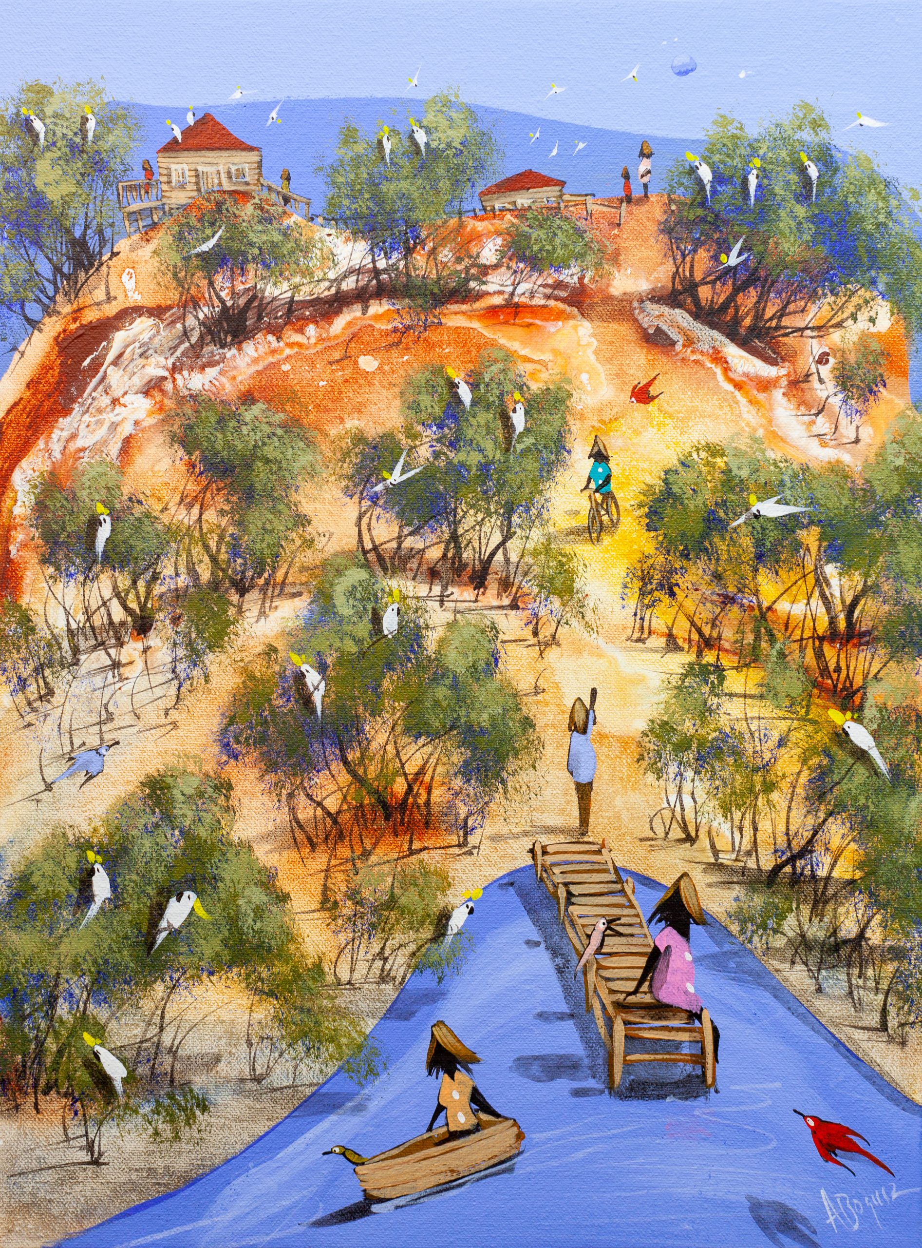 This series is a culmination of almost 25 years of painting. It draws inspiration from many sources, including my time growing up in Townsville, Nth Queensland, my father’s artwork, my wife and two children and Zen Buddhism. These images do not represent any particular place or time. I want them to have a universal appeal and ambiguity that allows viewers to write their own story into the image.