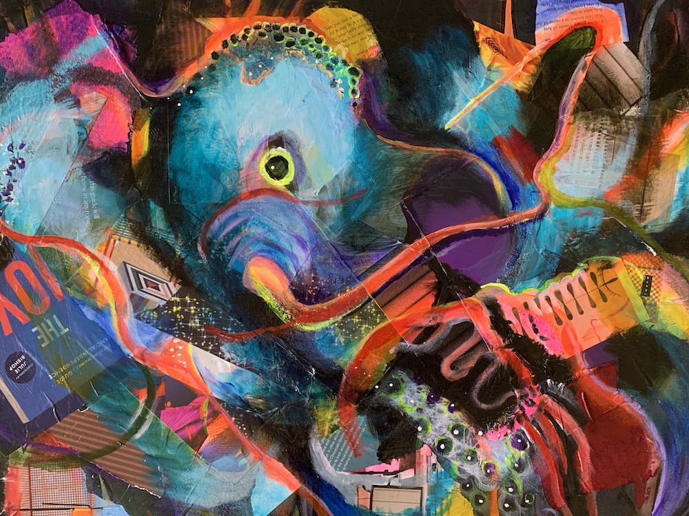 I painted the canvas a peachy shade and then glued on pieces of magazines and ribbon and cloth with medium.  I then painted in sections without having much idea of an outcome. It is a fun piece which I enjoyed creating. The sides are a deep blue black. Bright and contemporary.
