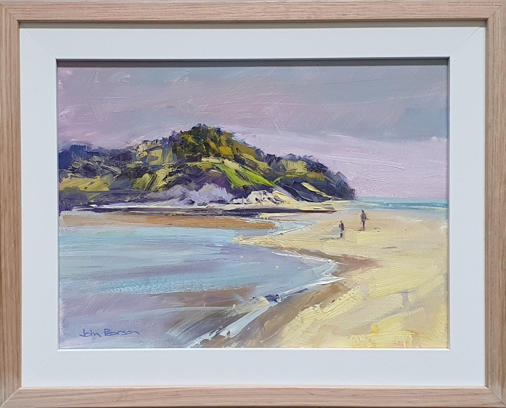 Painted on location on a bright sunny morning. Early walkers were taking advantage of the perfect conditions. Early rays of sunlight caught the dunes facing the ocean.
