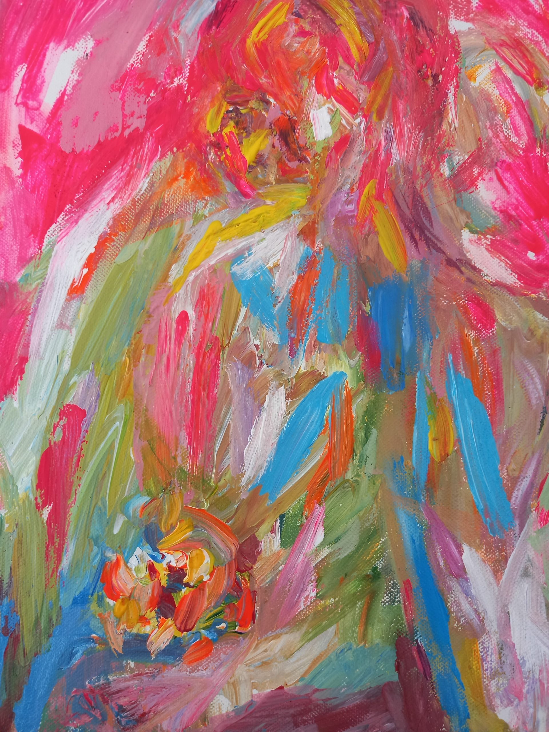 Loose colourful brushstrokes containing a subtle suggestion of a figure with flowers. A very expressive, atmospheric, light, breezy uplifting painting.
